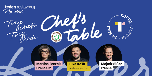 Izbrani gostje boste neposredno sedeli ob kuharskem dogajanju, kjer bodo chefi Martin Breznik, Luka Grič in Mojmir Šiftar pred vami pripravljali in predstavljali jedi v treh hodih. V izbranem terminu boste za skupno mizo okušali TR meni ter obenem spoznavali kakovostne slovenske sestavine in njihovo trajnostno ozadje.