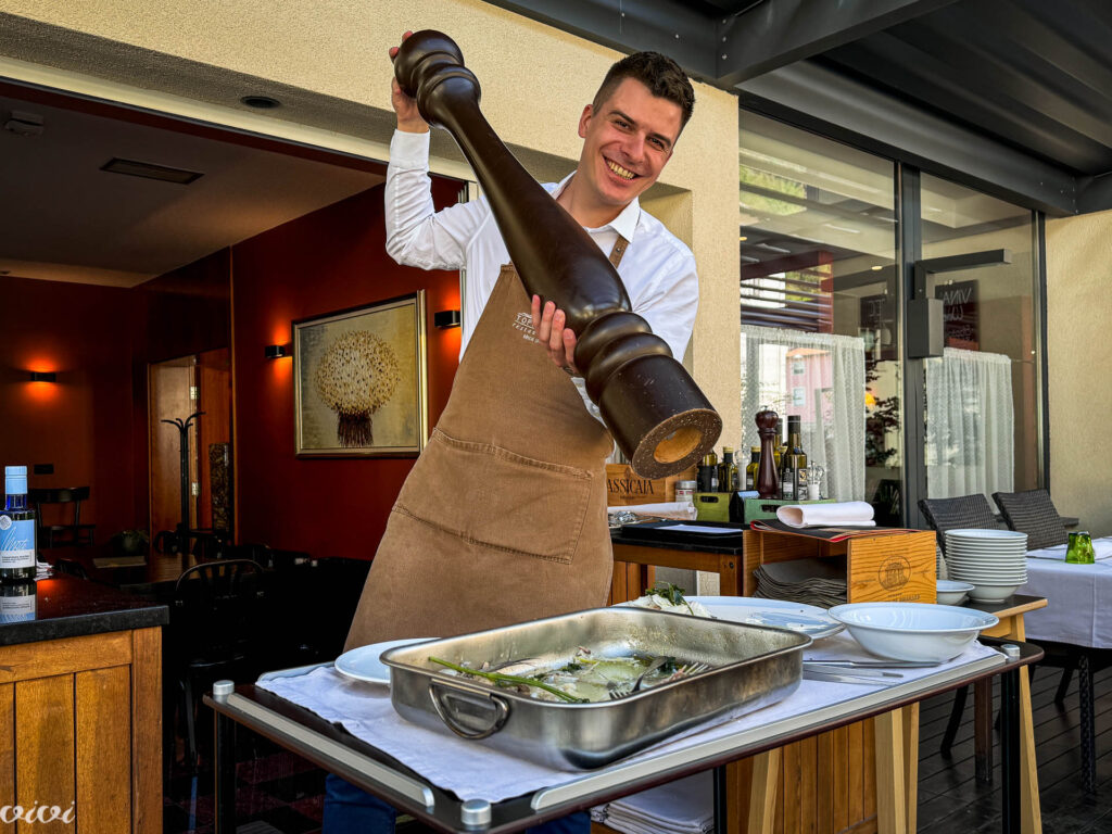 The sea breeze, which is always fresh under the mountains, is seasoned at the table by Žiga Hvala, in accordance with a 50-year (since 1976) family tradition, with two turns of a more than a meter long pepper mill.
