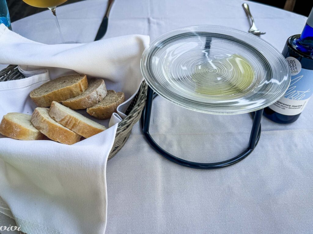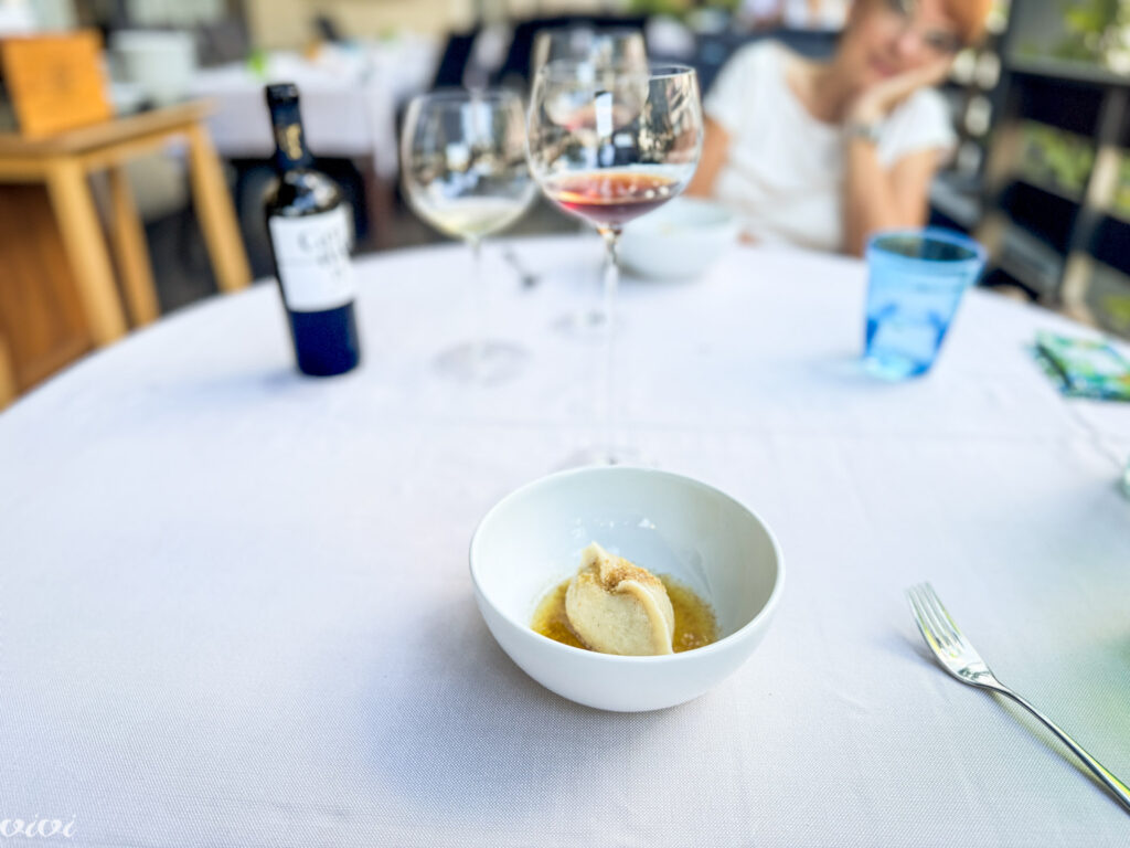 The empty greeting glass plate is then quickly filled with selected olive oil, Transparenza Marina, Mate, cuvee with a predominance of leccin. Who else doubts that in the center of Kobarid, surrounded by the mountains, we will eat only seafood and only good food?!