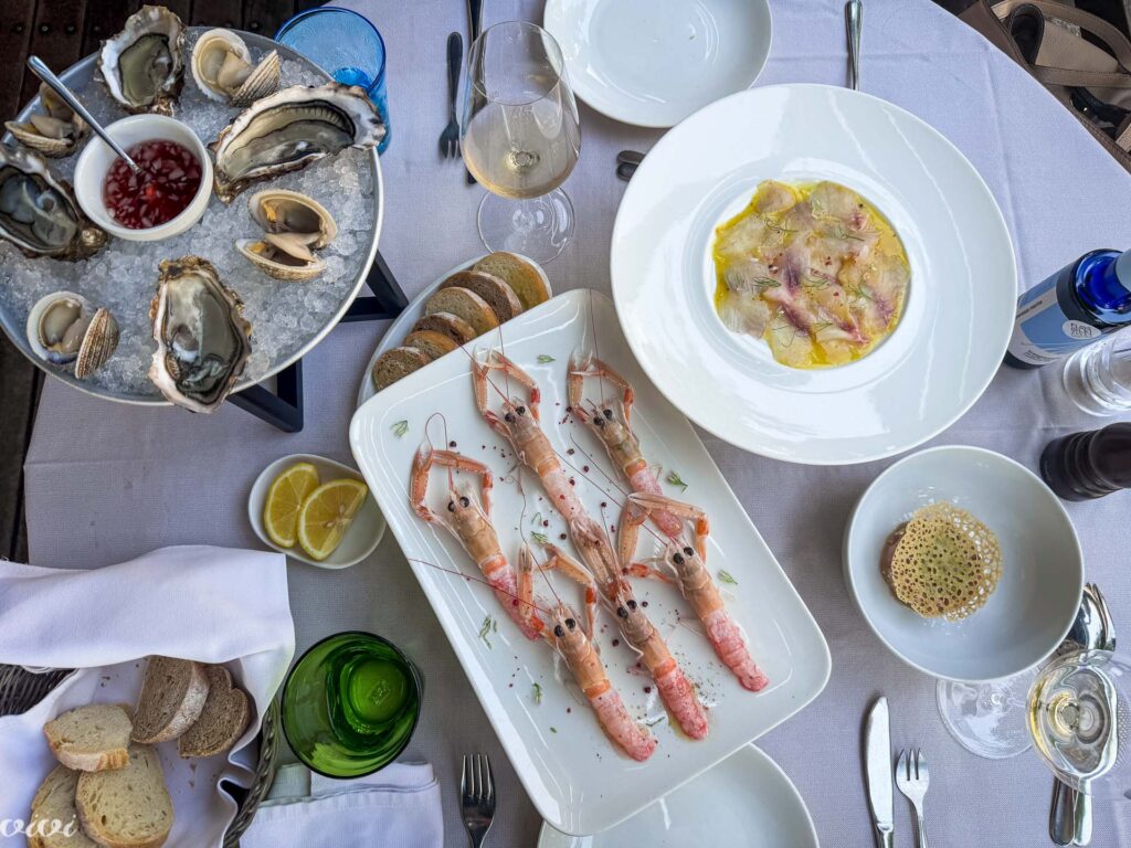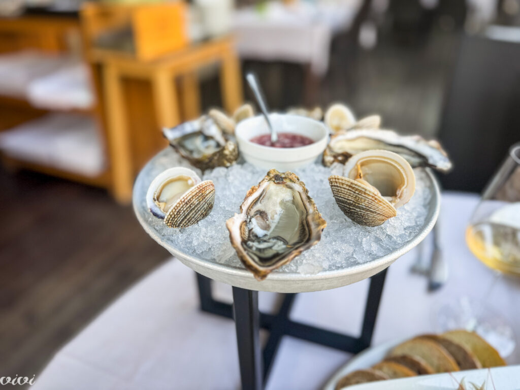 On the ice are raw oysters, from France, and cockles, from Dalmatia. They like just a few drops of onion vinaigrette.