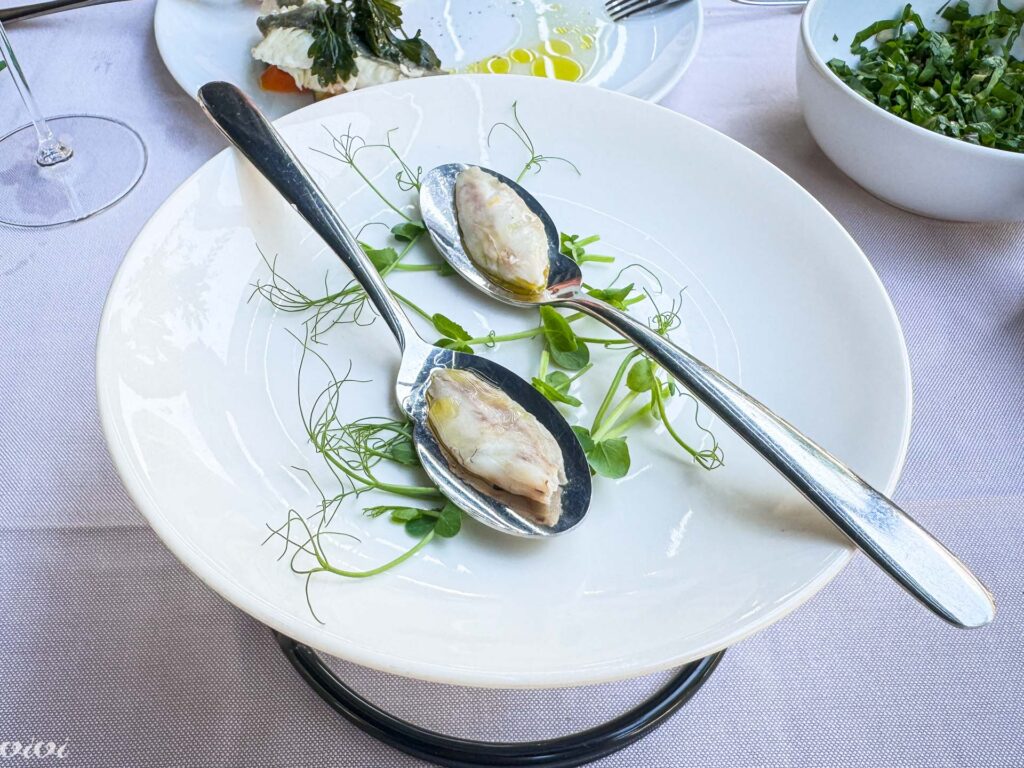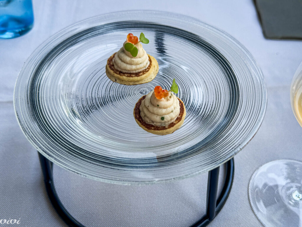First of all, on the terrace by the road or in the dining room with artistic paintings, you are greeted by careful tablecloths, white tablecloths and black service aprons, many bottles in ice and no waiting for a sparkling aperitif, accompanied by buckwheat blin, topped with local sour cream, paté from monkfish and trout roe. A small bite of delicious hospitality!