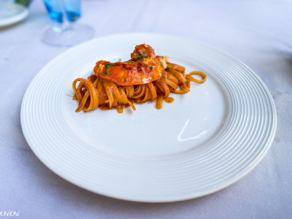 Noodles with lobster. The head and shell made a deep-sea bisque, the essence of a sweet-iodic aftertaste that “betrays” any good seafood restaurant.