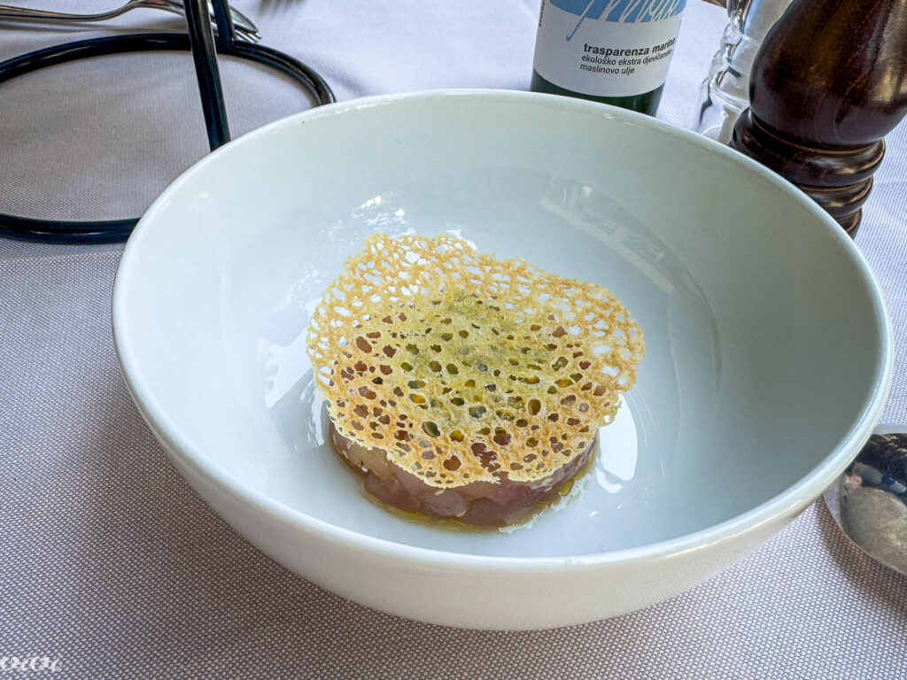 The tartar is made from common dentex, marinated with soy sauce, yuzu juice, passion fruit and sesame.