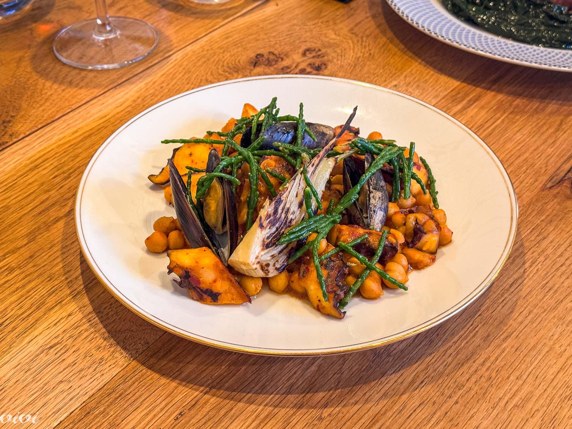 A giant octopus tentacle, nduja, chickpeas, mussels, salicornia and fennel on the plate. Since it’s for lunch, it’s a la ragu, but not from one pot, as each ingredient is cooked separately.