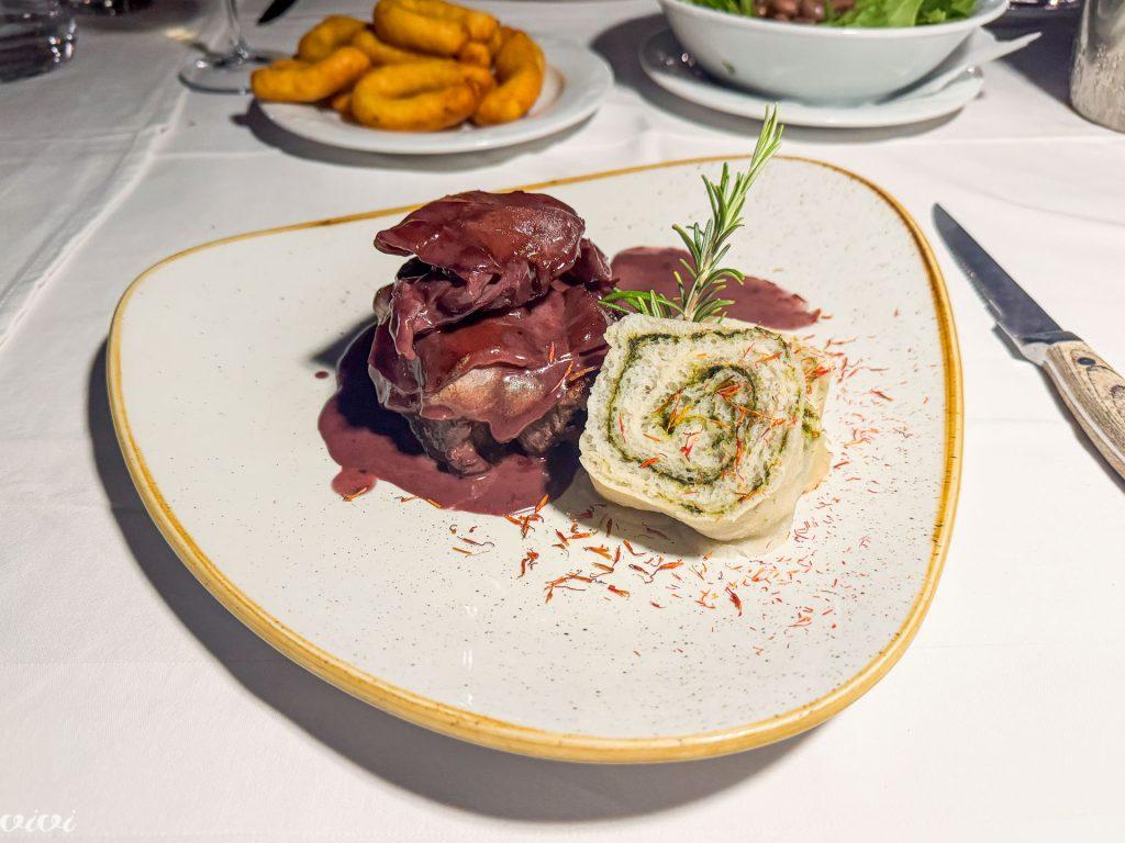 Steak with prosciutto in Teran sauce, štruklji with herbs.