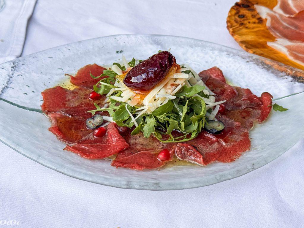 Deer carpaccio, arugula, parmesan, pomegranate, dates, sweet chips.