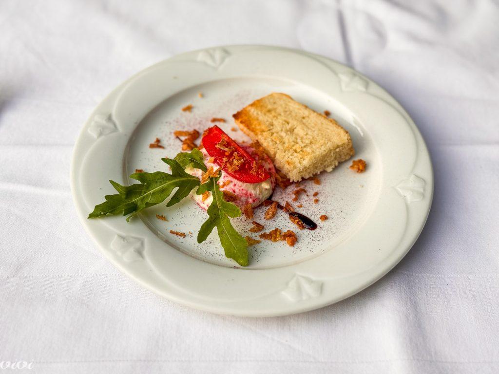 Šajna’s greetings from the kitchen: curd cheese, rocket, fried onions, balsamic cream, tomato slice, toasted bread.