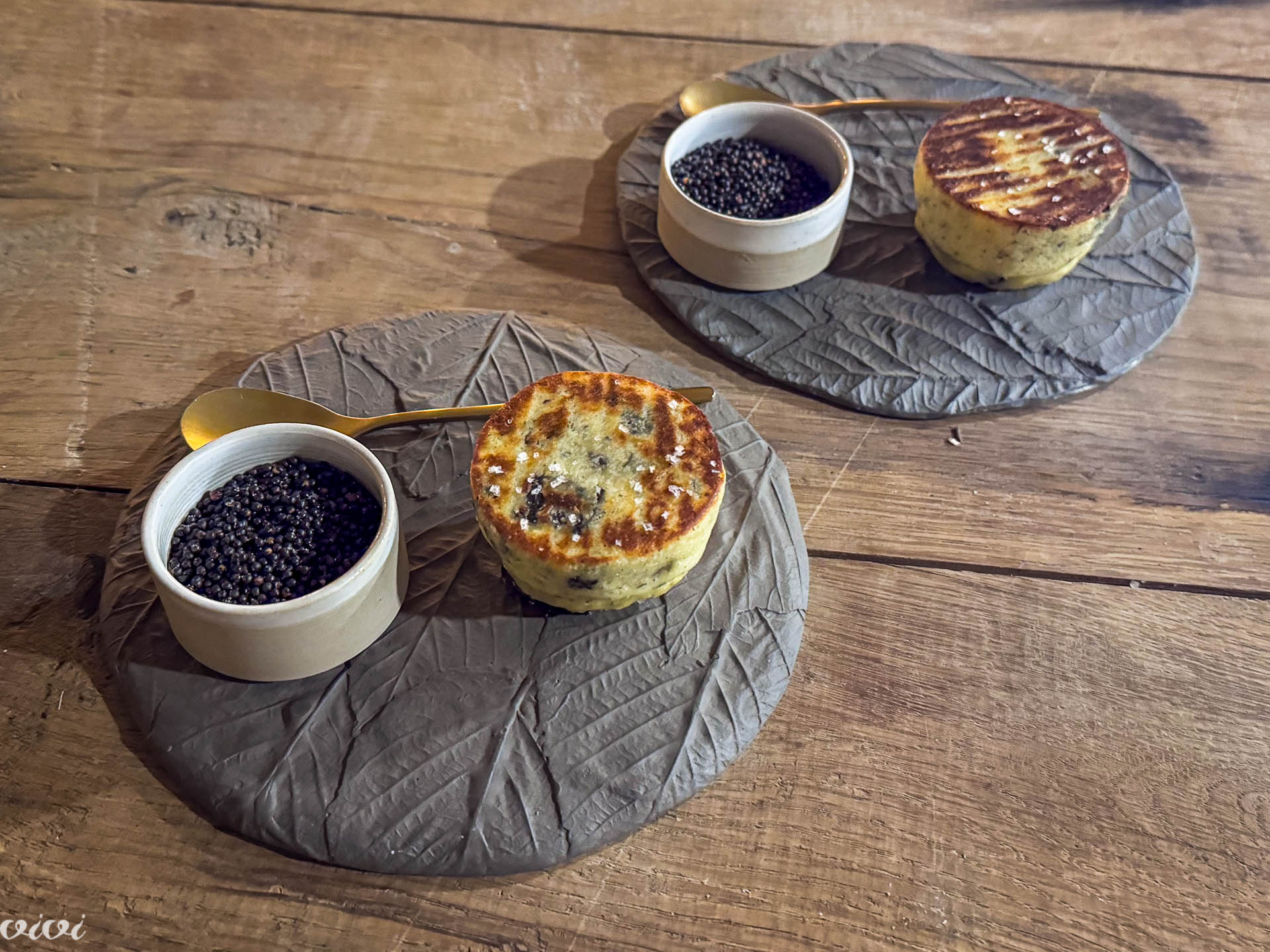 Rose sparkling wine, Medot, magnum, and next to it a table of welcome bites: on the stone is an egg roulade with zatar seeds and wild garlic cream; on a mini donut there is trout and sea fennel; between the sheets, which are made of breath-thin onion and cauliflower crackers, is brown butter cream with birch syrup.