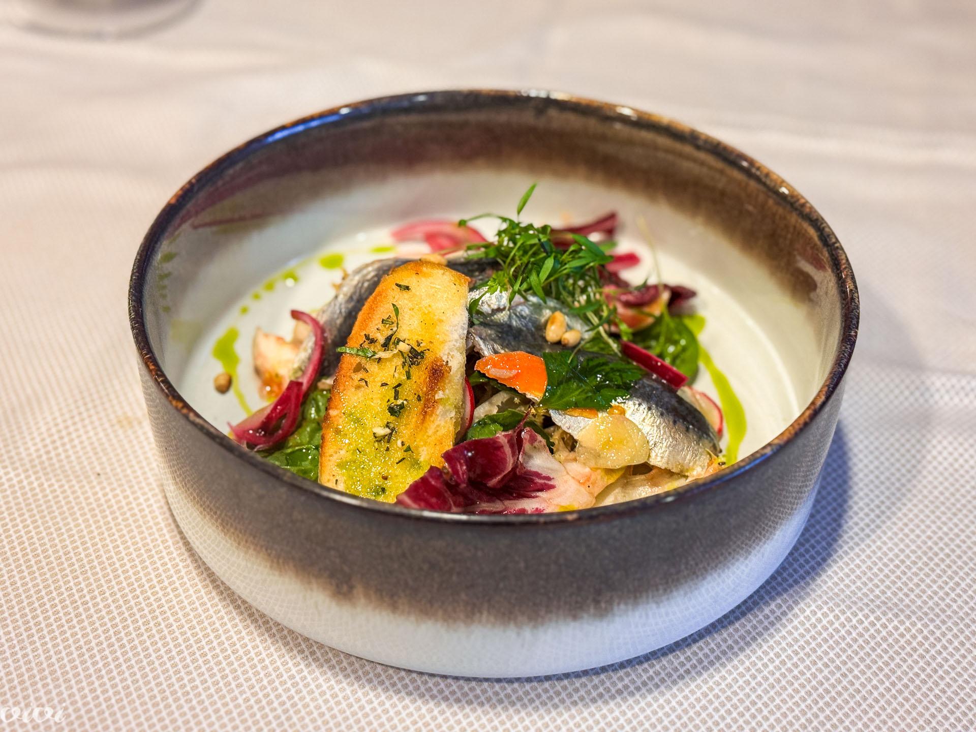 In the springtime, marinated sardines are simple and nostalgic on a bed of lettuce, with pine nuts, radishes, and pickled red onions.