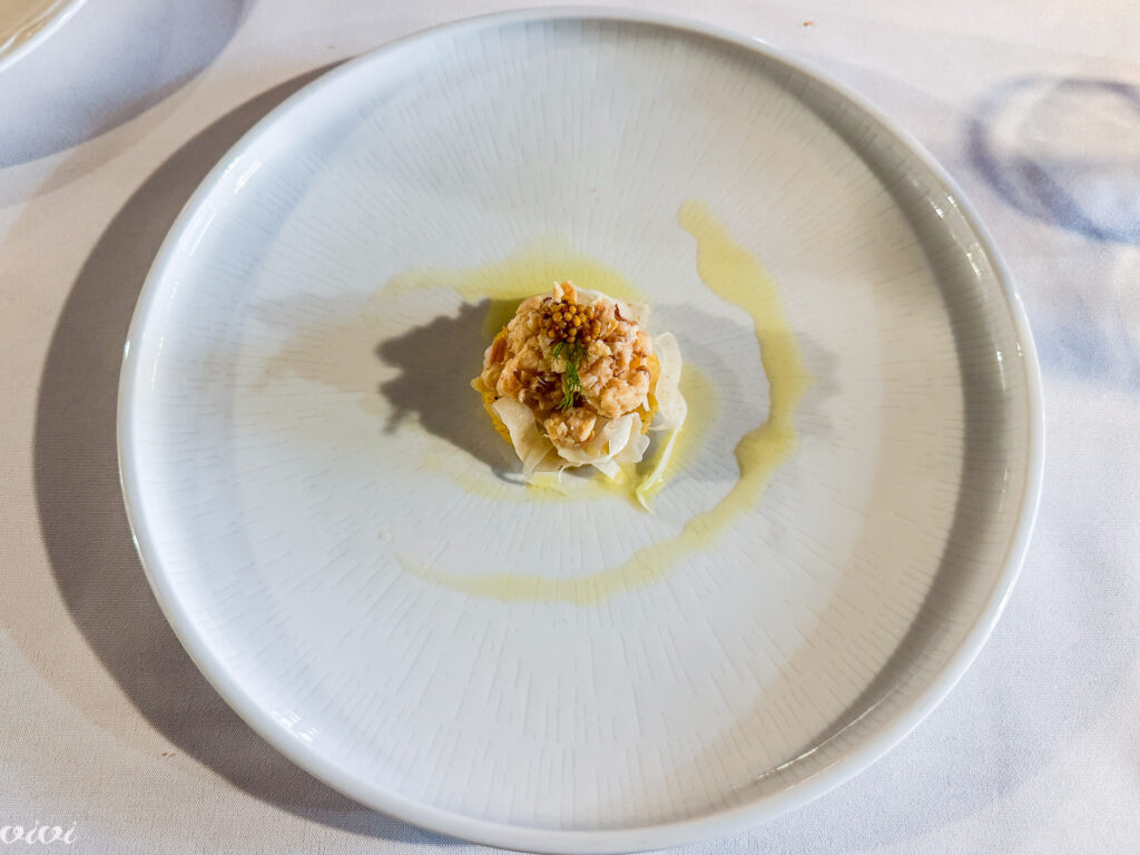 Smoked trout is crumbled on marinated fennel with olive oil and lemon, with a fluffy pancake of soft polenta underneath. The top of the trout flower is unobtrusively seasoned with pickled mustard seeds.