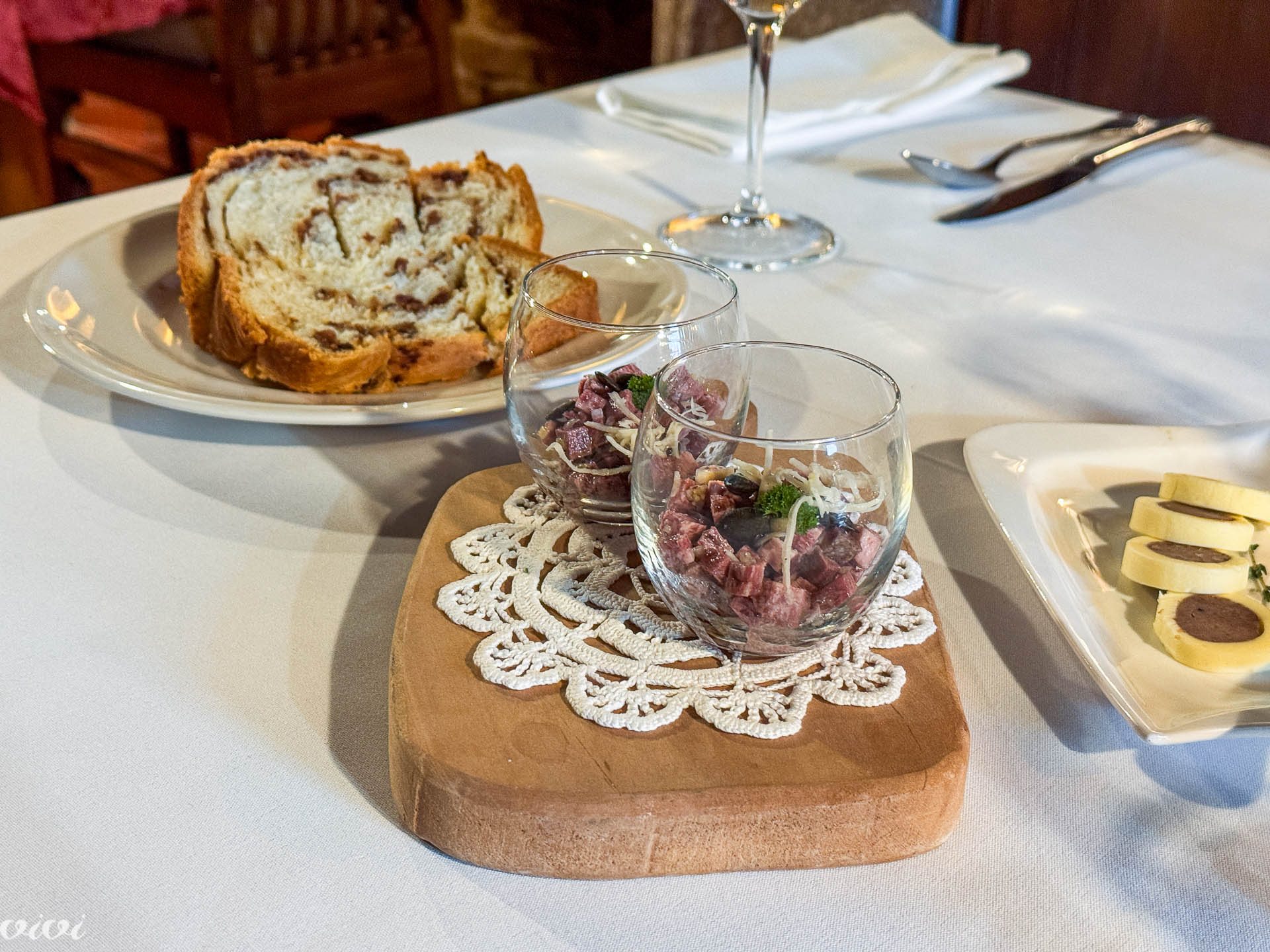 The kitchen greets us with a salad of smoked beef tongue with horseradish, onion and pumpkin seeds, with chicken pate in a buttery wrapper and with the legendary, large, foamy, fluffy, crackling potica.