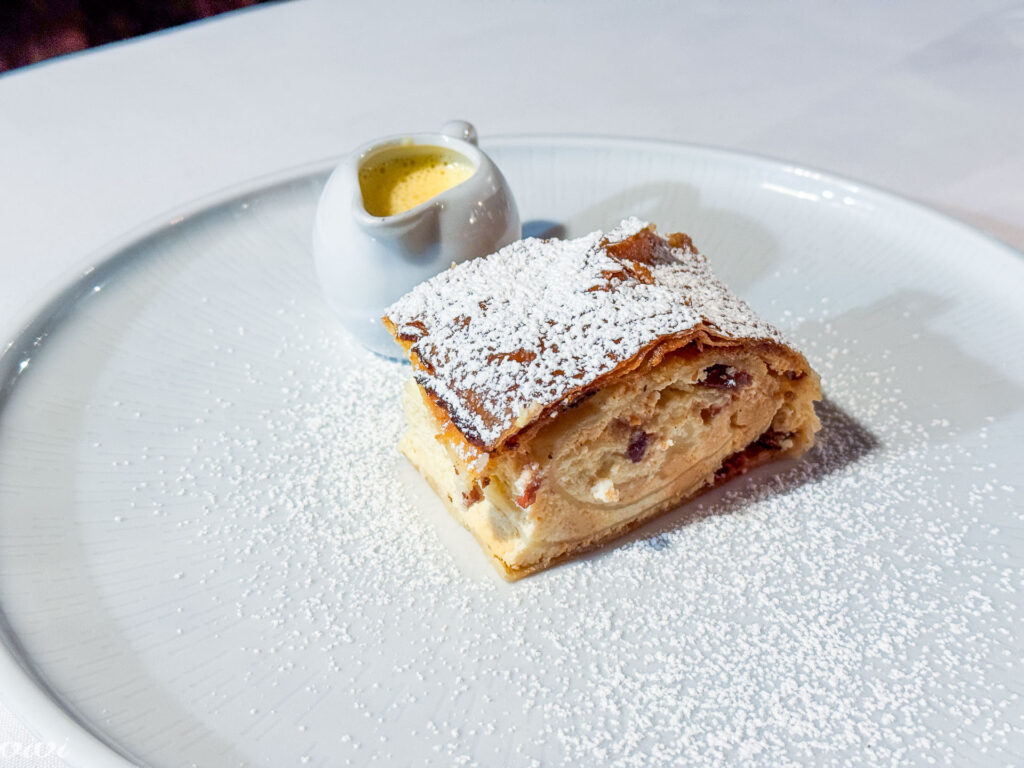 Curd cheese strudel and vanilla sauce.