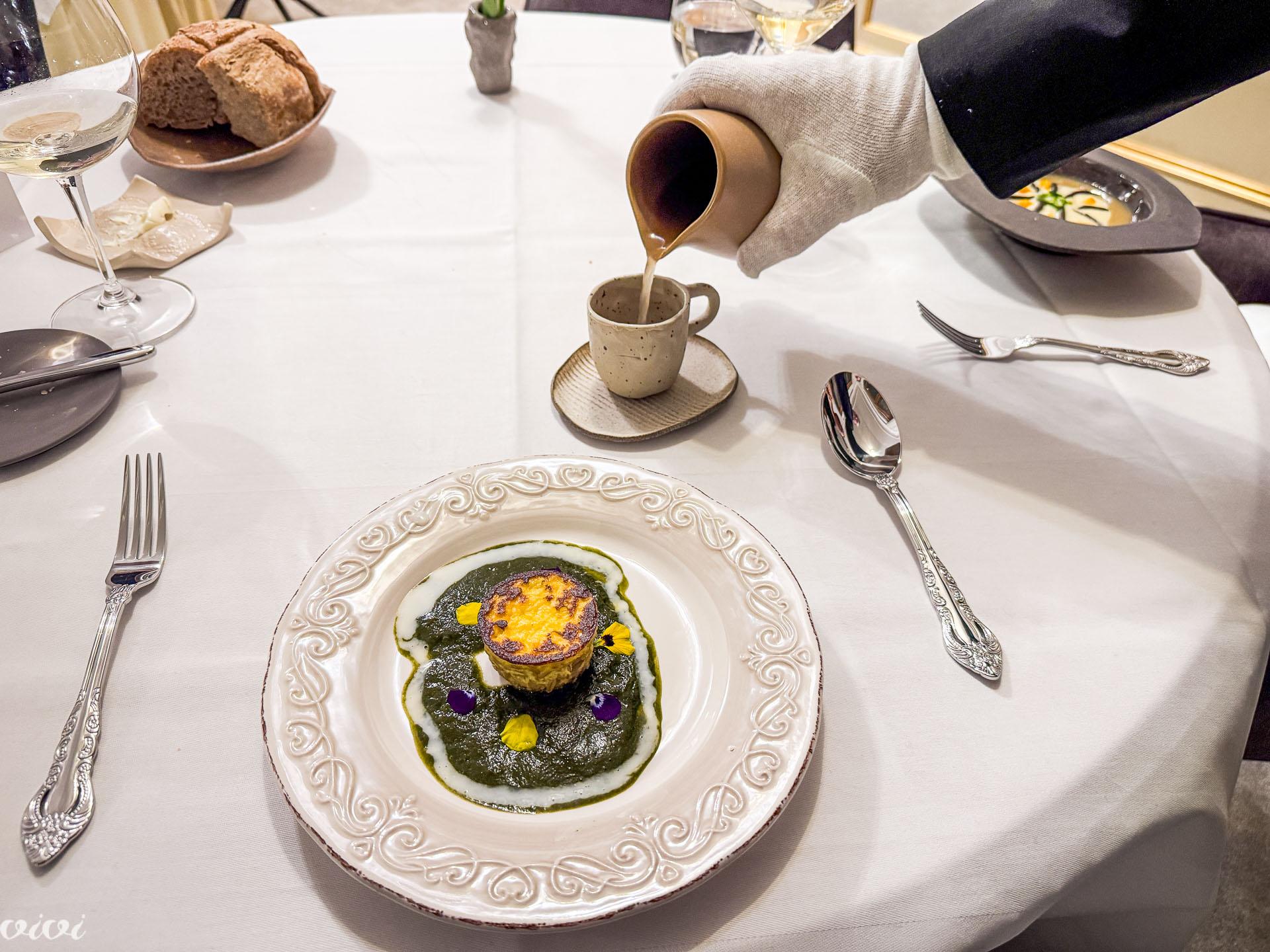 Deer loin, demi glace sauce, porcini mushroom soufflé. Pumpkin seed powder (oil, pumpkin seeds), demi glace sauce with cloves and red wine, savory shortcrust pastry pie filled with parsley cream and refreshed with radish marinated in rice vinegar.