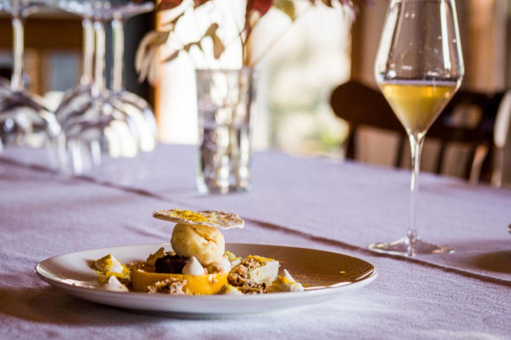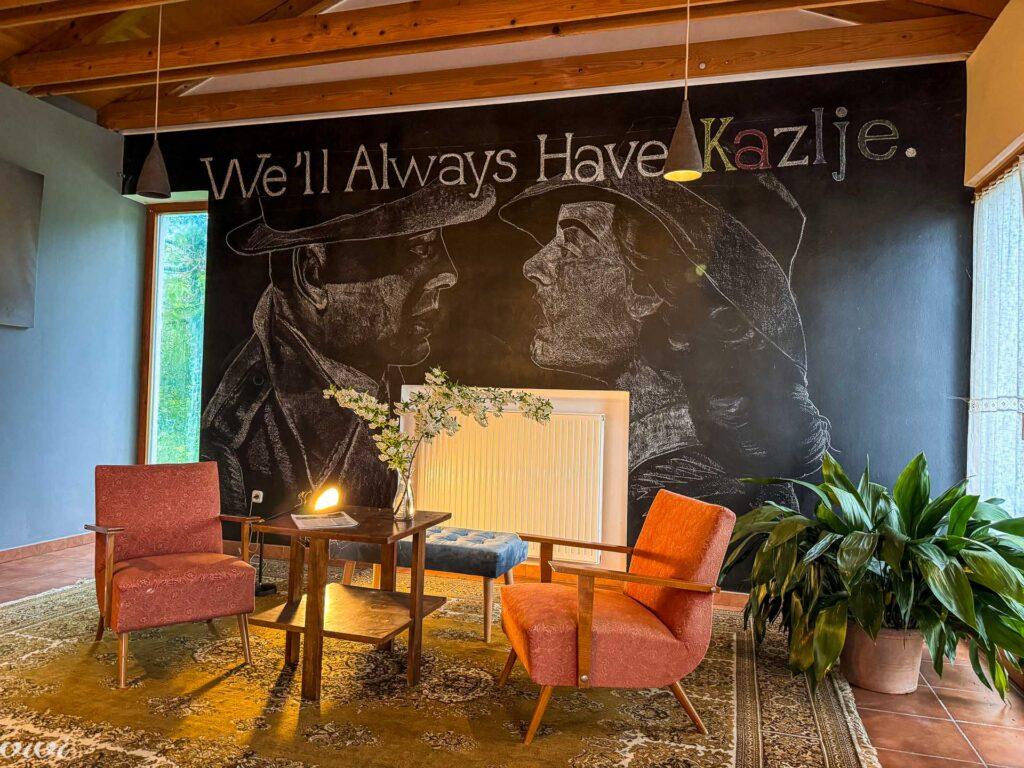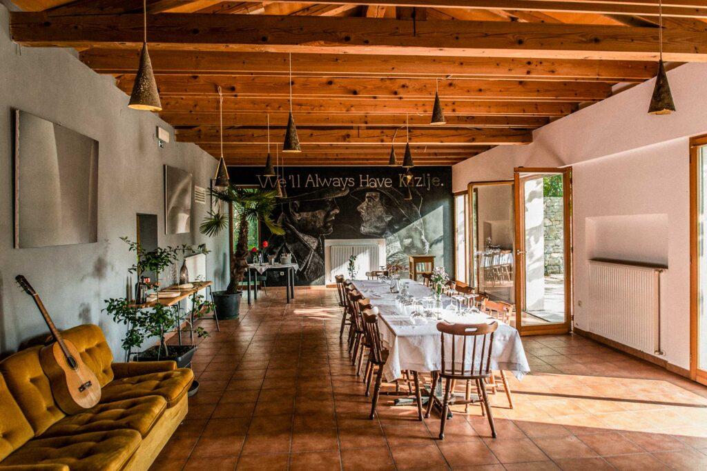 In the Karst bura winds, the Japanese phrase ‘omakase’, which means ‘I’ll leave it up to you’, is an adventure in itself! The first challenge is to find the small village of Kazlje, then the next is to find Camut in Kazlje … Once you find it, you’ll find that everything is as it should be in the village hall: an old sofa for the tired, toys for children, a serving hatch for the chef, orange wine for the trendy, and a translator for the ‘secretive’ menu.