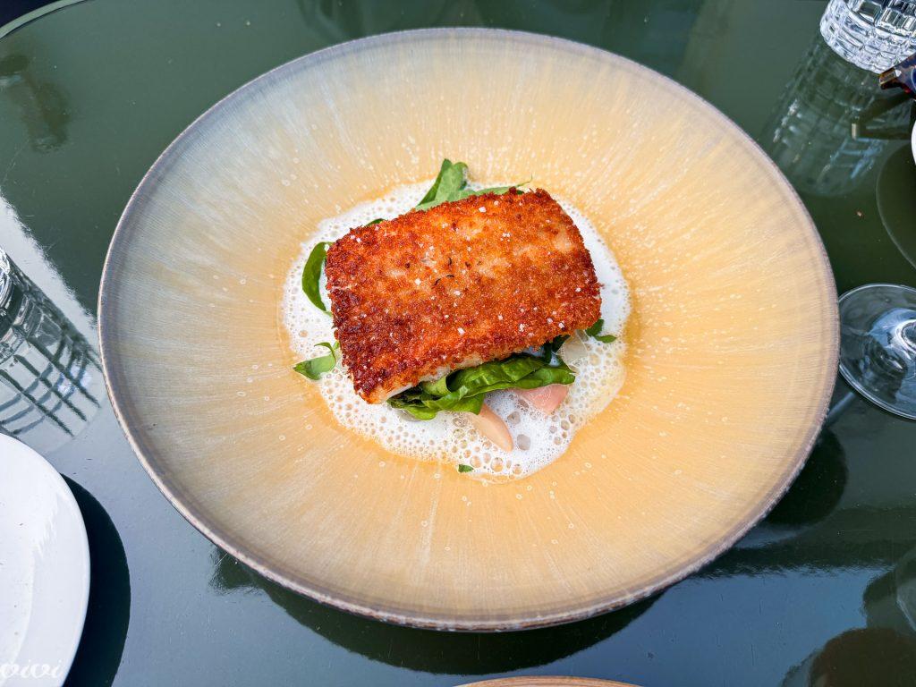 Brancin v kruhovi skorjici, majska repa, listi sveže kislice, dimljeno mleko. Brez nepotrebnosti, nobenih kremic in penic, vse združeno v celoto, ki jo nadgradijo zadnji grižljaji z žlico. Za takšen file mora brancin dovolj let plavati, okrog njegove sočne beline je bila všečna krušna hrustljavost, ki pa ni bila dunajska, milanska, japonska ali ljubljanska, temveč chefova, posebna. In spet je bilo bistvo okrog, v spenjeni mlečni omaki, ki je ocvrti ribi dodala dimljene, čisto drugačne note.