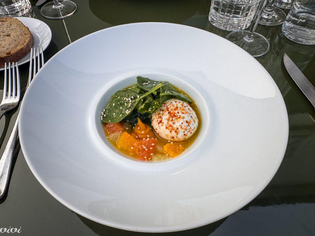 Preprostost sestavin, ki je bila z njihovo odličnostjo, spretno nadgrajena: zelenjava in sadje, surovo, blanširano, okisano, začinjeno, za kopel nežni burrati, ki se je iz sredice zapeljivo vlekla do ust. Špinača in njeni poganjki, citrusni vinaigrette, rdeča grenivka, pomaranča, sezam, začimbe, sladke, pikantne, blage, pekoče.