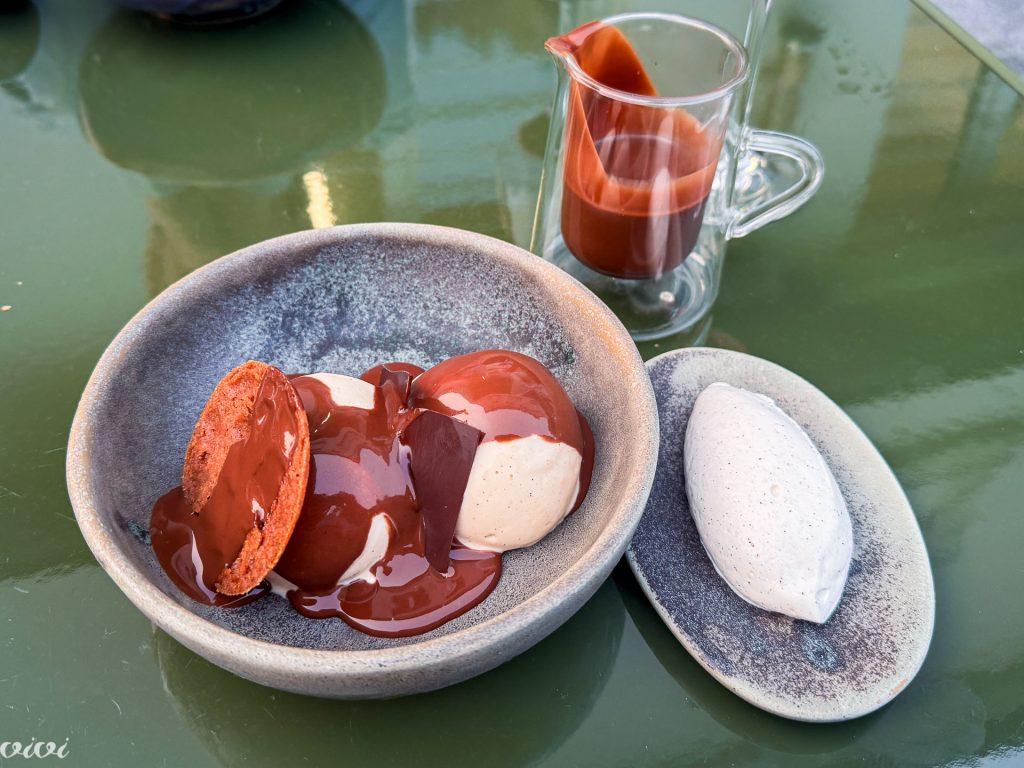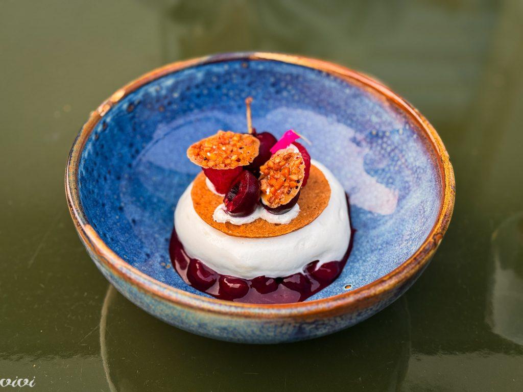 Sladice – klasične, vendar nadgrajene – so (najbolj) presenetile. Sicer pa je chef, ki je bil vmes tudi osebni kuhar francoskega vojaškega atašeja v Washingtonu, začel kot slaščičar. Ne breskev, temveč češnje Melba, z višnjevim sorbetom in hrustljavimi lističi iz testa z lešniki.