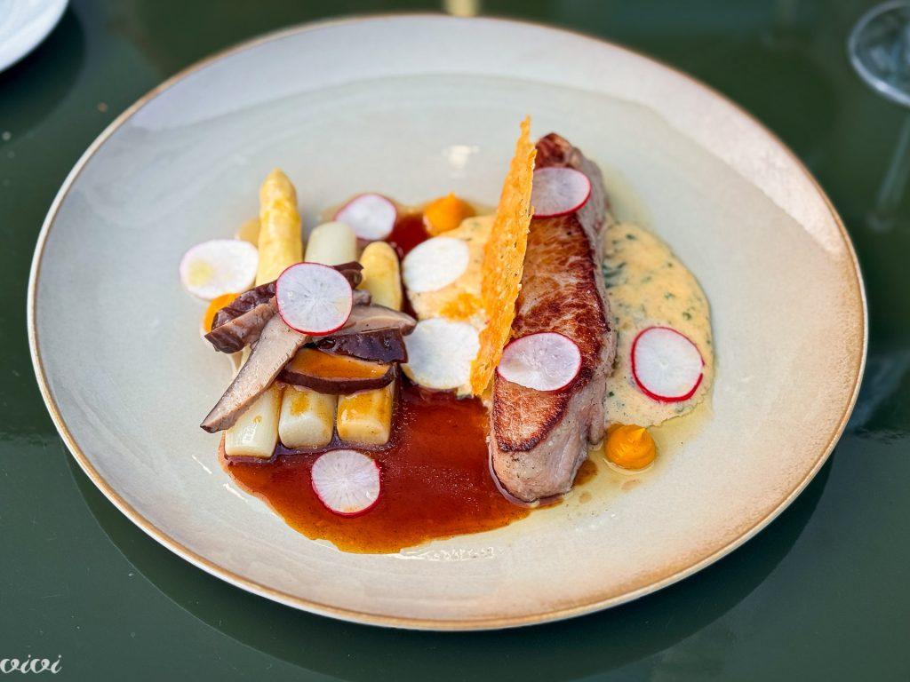 Pečena telečja rebra, beluši, šitake, kumkvat. Rebra kot steak, ne, torej, počasi in dolgo, temveč hitreje in močno (pečeno), zaradi teletine sicer pusto, toda zaradi pečenja na rdeče (rare) vseeno sočno. Sotirane šitake, kumkvatova krema, sveže redkvice, telečji jus, jajčna omaka z drobnjakom (bearnaise), čvrsti beluši, vse skupaj že ”videno”, a tudi zato doživeto bistronomsko, saj je vsak element, detajl in člen natančen.