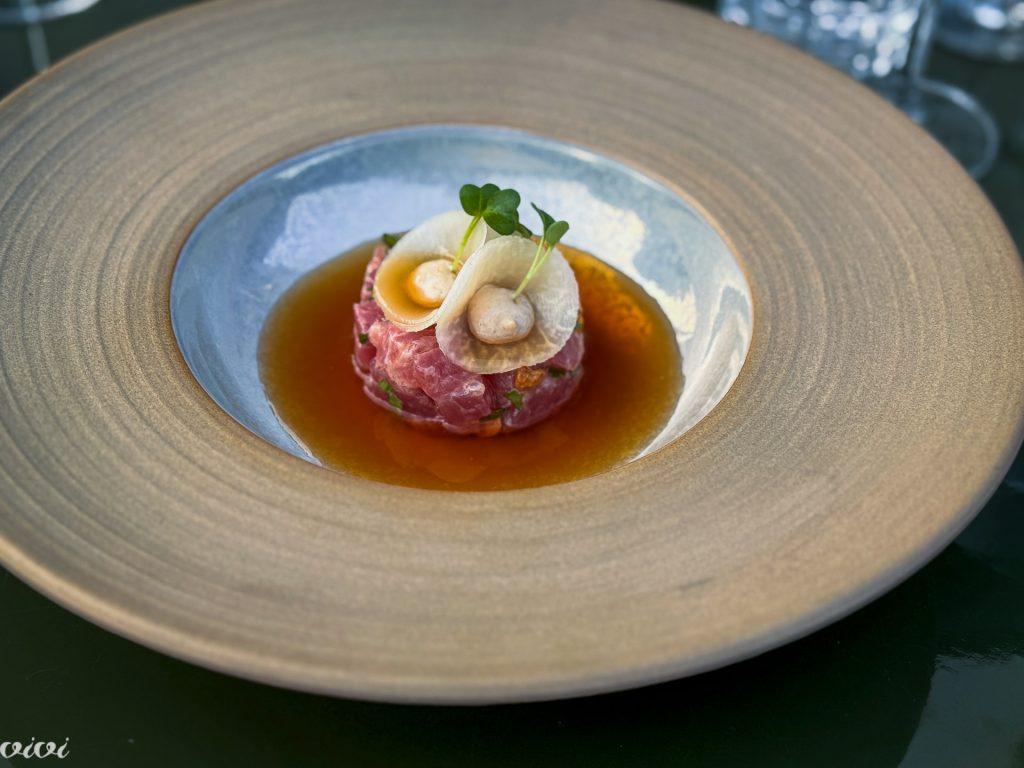 Tunov tatar se ne sliši preveč razburljivo. A se lahko okusi čisto drugače! Dokaz, da ni vsak tatar le sekanica … Večji kosi atlantskega tuna so bili ohlapno zloženi v stolpič skoraj prosojni, kar je pomenilo, da se niso ”kuhali” v slani marinadi. Raje so bili, najbrž tik pred zdajci, maščobno prevlečeni. Krema iz indijskih oreškov jih ni prekrila, temveč je, nasprotno, še poudarila tunovo surovost. Maščobnost ribe in kreme je uravnavala sočnost majske redke. Zato je bilo bistvo tuna dejansko v morju, v umamiju daši juhe, v kateri je plaval.