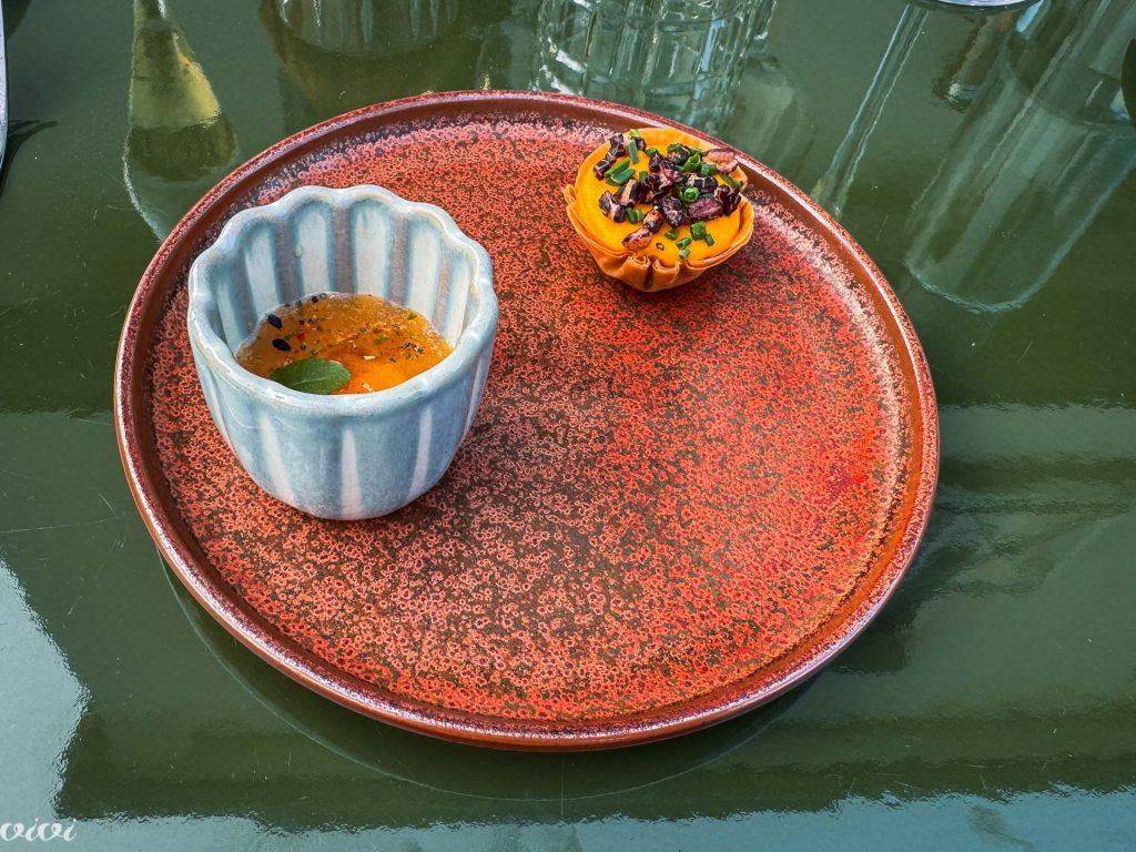 Francoski chef Jean-Charles Hospital je pozdravil miniaturno, toda chic …, v gracilni, hrustljavi tortici s korenjem, v skodelici z dinjo, s pikantno, gosto, zelenjavno kremo in osvežilno, hladno, sadno juho. Natančnost izvedbe in okusnost idej sta na jeziku topljivo opisali stopnjevanje vsem znanih, popularnih, všečnih, klasičnih bistrojskih jedi do bistronomnosti.