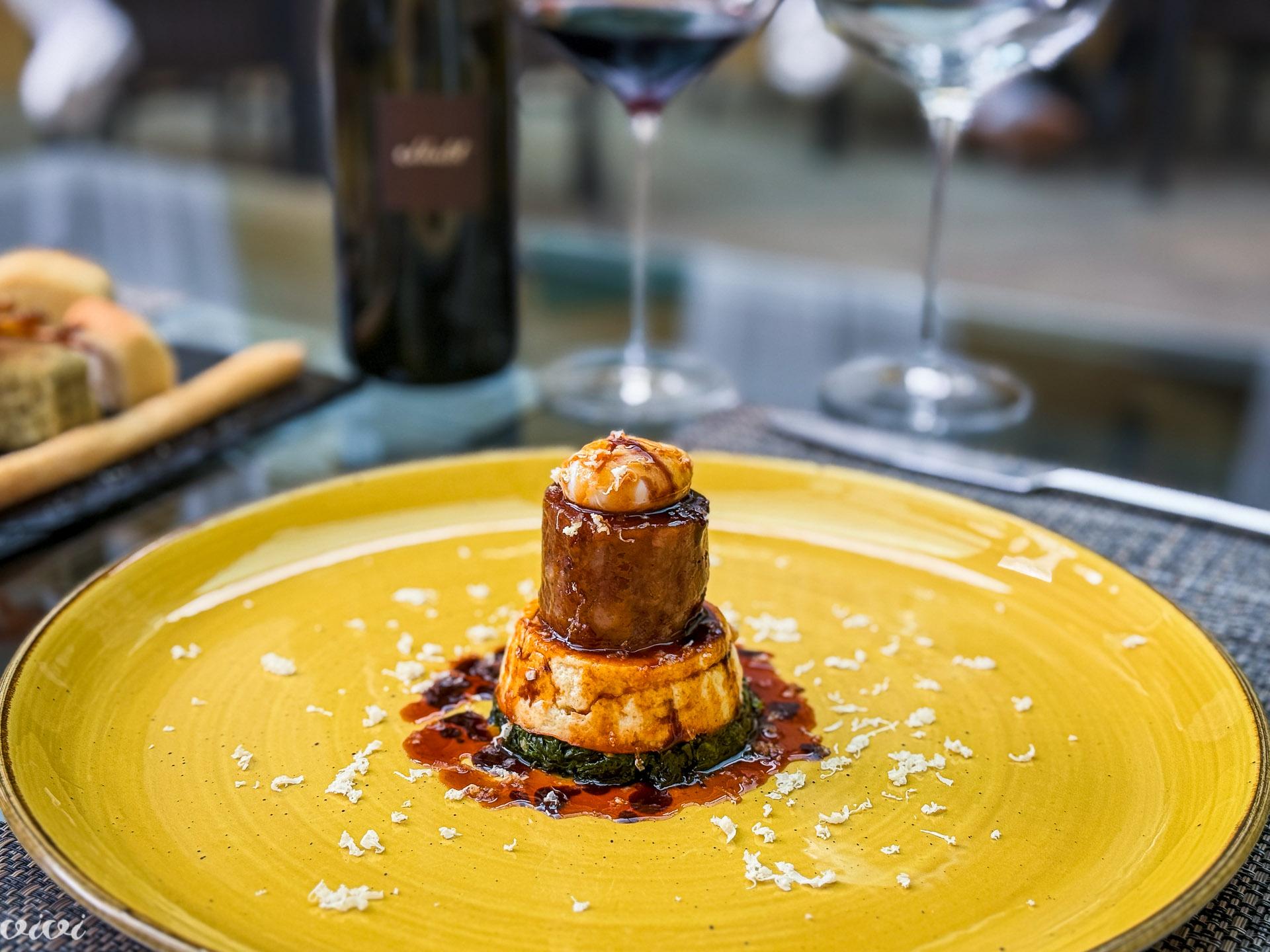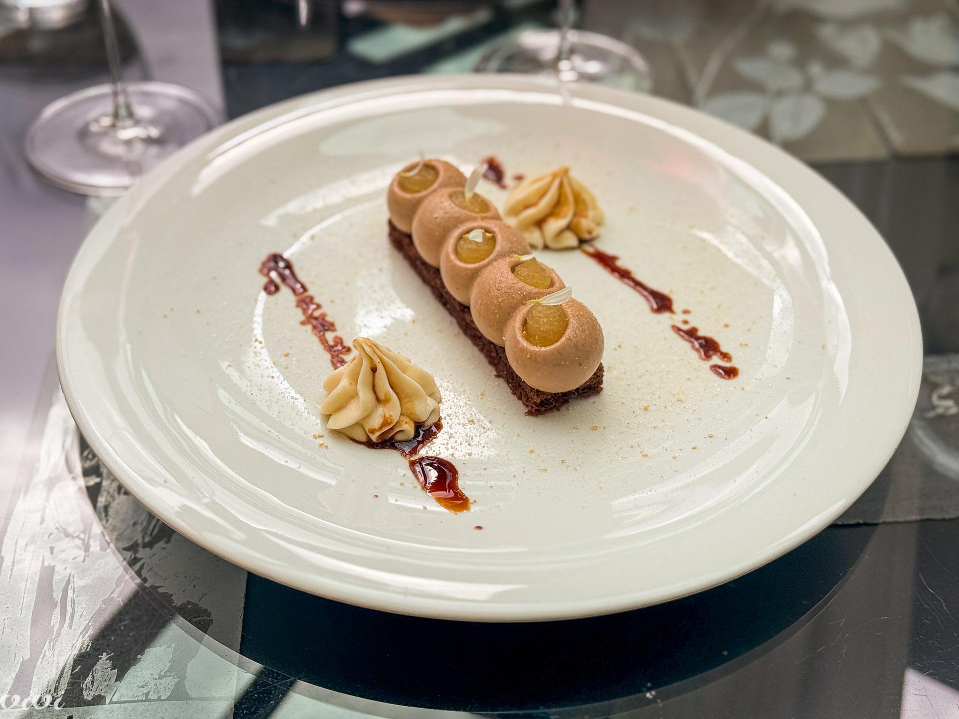 Foie gras ”po naše” je s pinjolami, pistacijami in suhim sadjem, spremljata ga marinirana hruška z žafranom in gel ”iz našega domačega limončela”. Ker okušamo Francozova vina z briškim dialektom, je zraven terina zamaščenih gosjih jeter ”obvezna”, saj si jo naroči tudi Francoz, ko gosti gruzijske goste in z njimi razpravlja o svojih briških vinih v ”njihovih” kvevrih.