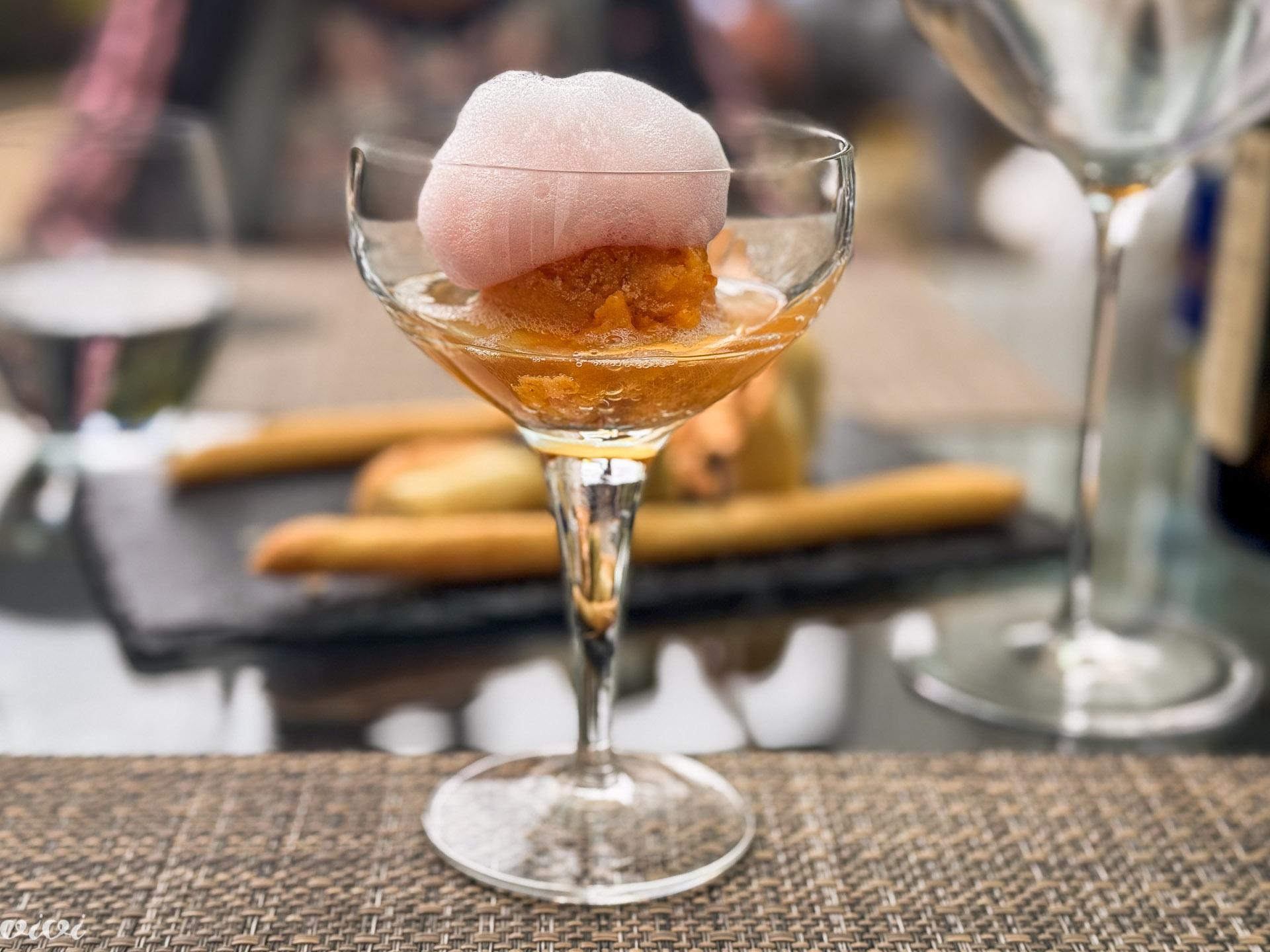 Iz kuhinje stopi le na teraso in si utrga, kar potrebuje. Kakijev sladoled je s peno brusničnega soka. A ne smemo še začeti, saj prej stopi še v klet, da čezenj dolije Pét-nat Hydra 2021 (malvazija). Očiščenje pred mehkimi kožicami.