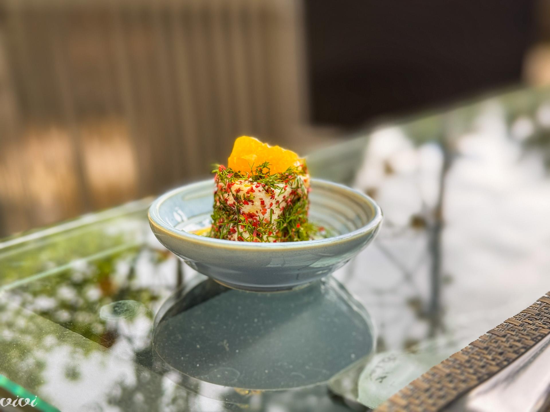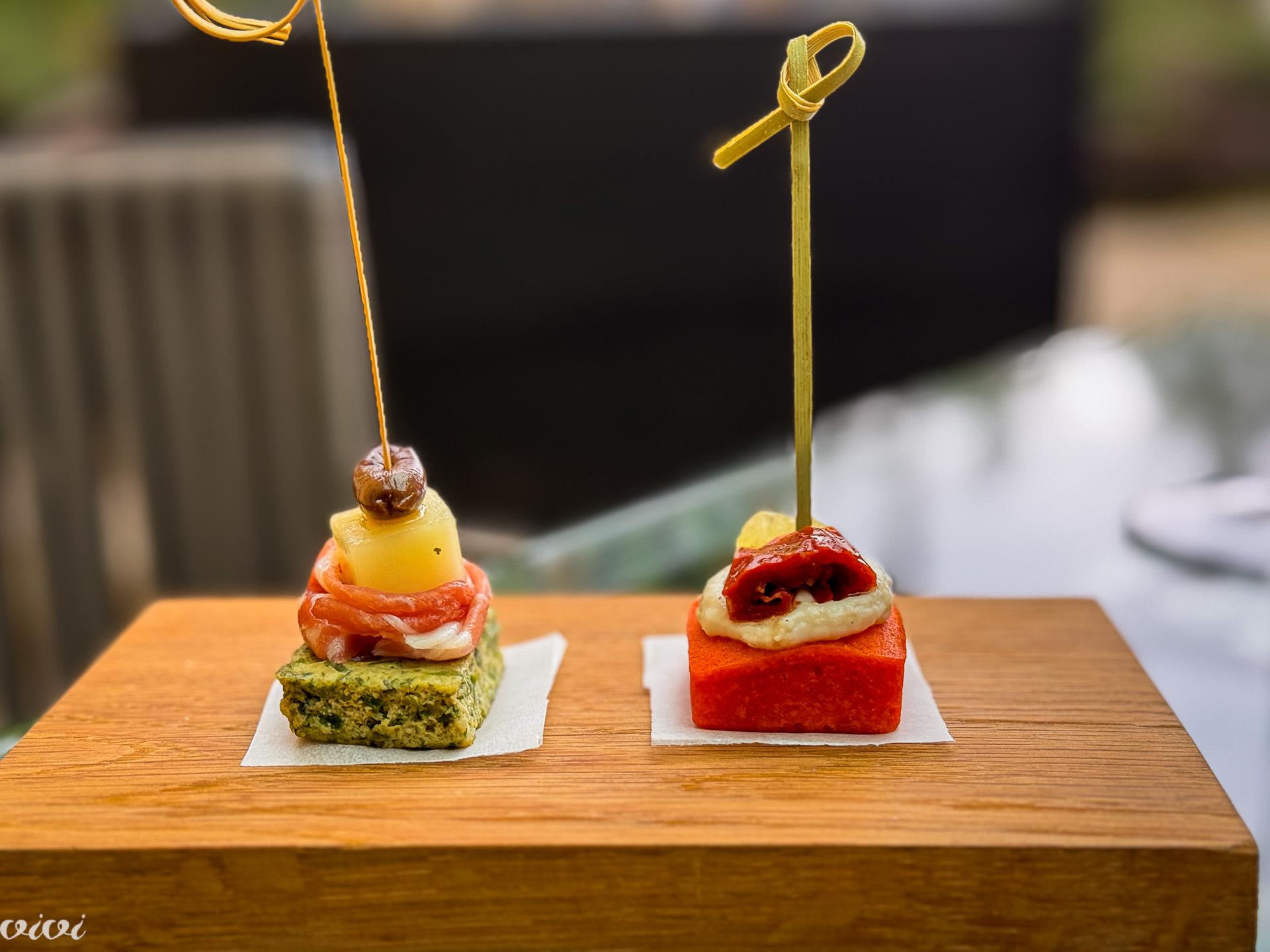 Ker sta chefa dva, sta tudi dva amuse bouche grižljaja: briška frtalja z zelišči, domači pršut, kozji sir in oliva. Frtalja kot je tukaj običaj, nič moke, le jajca in veliko zelišč; melisa je srčna zel, beli vrtič je modrjalca, koromač je le divji in zelo zeliščno je tudi Kabajevo oljčno olje. V drugem grižljaju je paradižnikov biskvit, s kremo prekajene postrvi, sušenim paradižnikom in limeto. Kruh je eden s pršutom in drugi z bučnim oljem, hrustek je z makom, grisini so od sosedov.