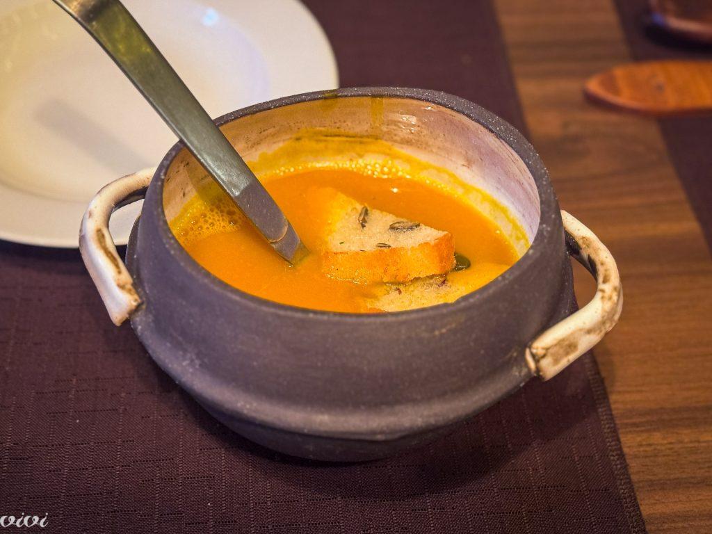 Bučna juha iz hokaido buče iz Zrkovc, bučno olje, bučna semena. Najprej opaziš nov jušnik (keramika Manja Fürst). Nato opaziš, da si moraš bučno olje sam doliti. In nato moraš pohiteti, ker se bo kruh (z bučnicami) preveč razmočil. Sicer pa je to bučna juha, ki jo dobiš v jušniku zato, da si jo še enkrat naložiš. Bučna juha, brez katere ni jeseni. Za kar gre zahvala tudi temu, da ni ‘popravljena’ s smetano.
