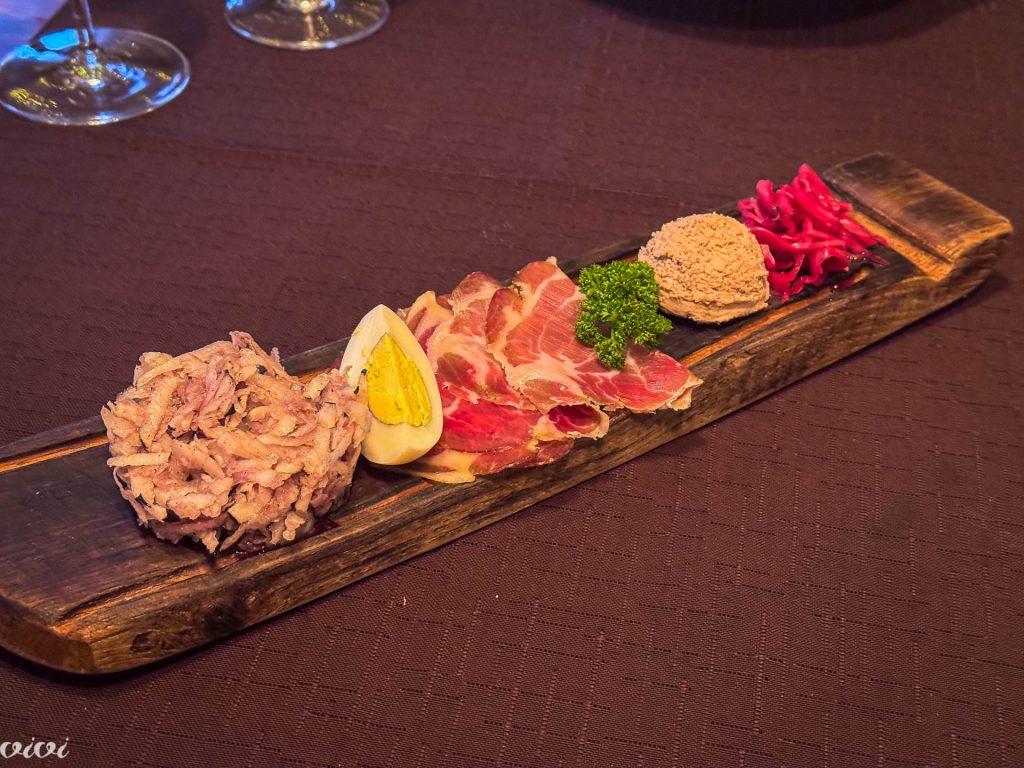 Naribana črna redkev s štajerskim bučnim oljem, pohorska bunka, domača jetrna pašteta, vložena okisana zelenjava, jajček. Na deski je lep scenosled sezonskih in lokalnih jedi. Glavna je solatna črna redkev, ker je lokalna in sezonska posebnost. Nagrada je pohorska bunka, ker je še večja posebnost. Hišna je jetrna pašteta, ki jo že poznamo (pozdrav). In osvežilno je kislo zelje, ki ni fermentirano, temveč le barvno okisano, kar ga tudi naredi posebnega.
