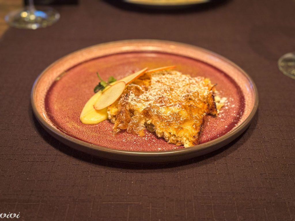 Jabolčni zavitek z vanilijevo kremo in cimetom. Povsod je štrudelj celoletna sladica domačih gostiln, ki se temu primerno generično tudi pogreva. Čeprav ga imajo vsi, je pri redkih res posebnost. Pri Verniku pa je posebnost že zato, ker je (jabolčni) v sezonski ponudbi. In ker ima ob jabolkih v nadevu tudi skuto, je drugačen tudi zato, ker je takšen kot doma, kjer vedno kaj manjka, ali je premalo skute ali jabolk, zato se pač znajdemo. In to je pri tem ‘negostilniškem’ štrudlju odlika!