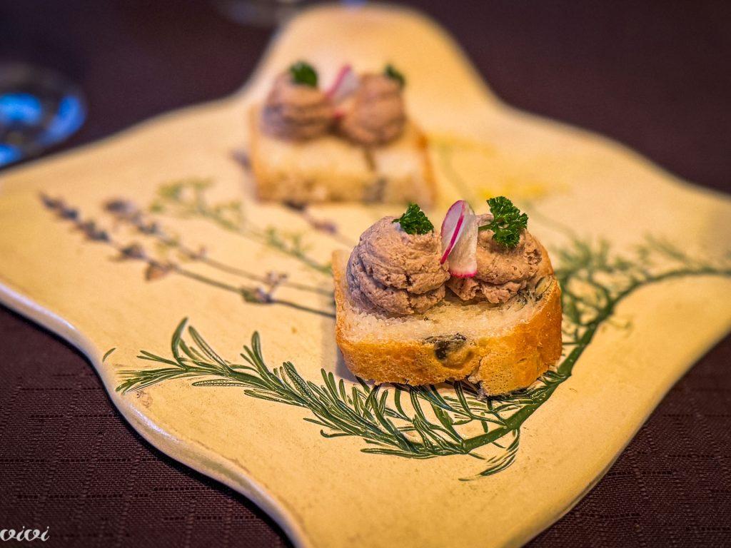 Pozdrav iz kuhinje: domača jetrna pašteta na domačem belem kruhu z bučnimi semeni. Če je v pogrinjku domač sveži kruh v praktičnem celofanu, je pozdrav, na katerega gostu ni potrebno dolgo čakati, primeren razlog, da razdreš lepo zložen prtiček. To je primerna dobrodošlica v domači gostilni, ki se tudi z njo, in – pomembno – že takoj na začetku loči od generike, površnosti, množičnosti in slabe gostilniške prakse. Pozdrav iz kuhinje ni modna kaprica, temveč dobrodošlica, znak gostoljubja! Zato v domači gostilni zadošča kos dobrega kruha in na njem iskreni okus domače paštete. Tudi zato, ker ima ta kos kruha skrbno izbran ‘scenarij’ – postrežen je na keramičnem ‘herbariju’.