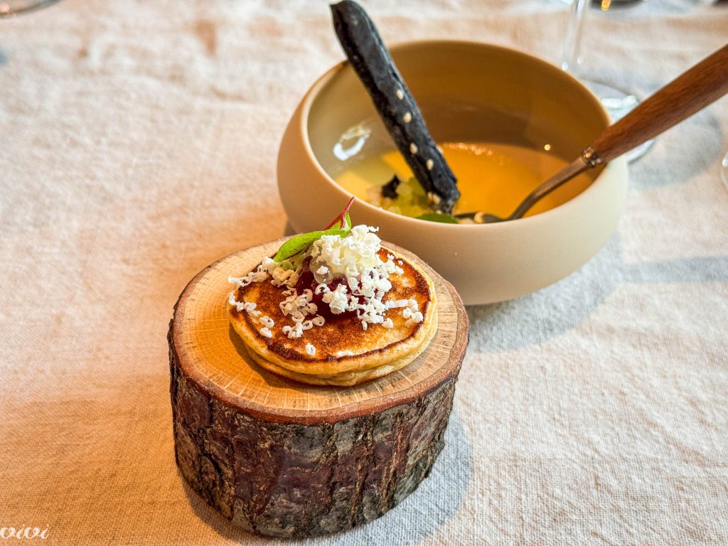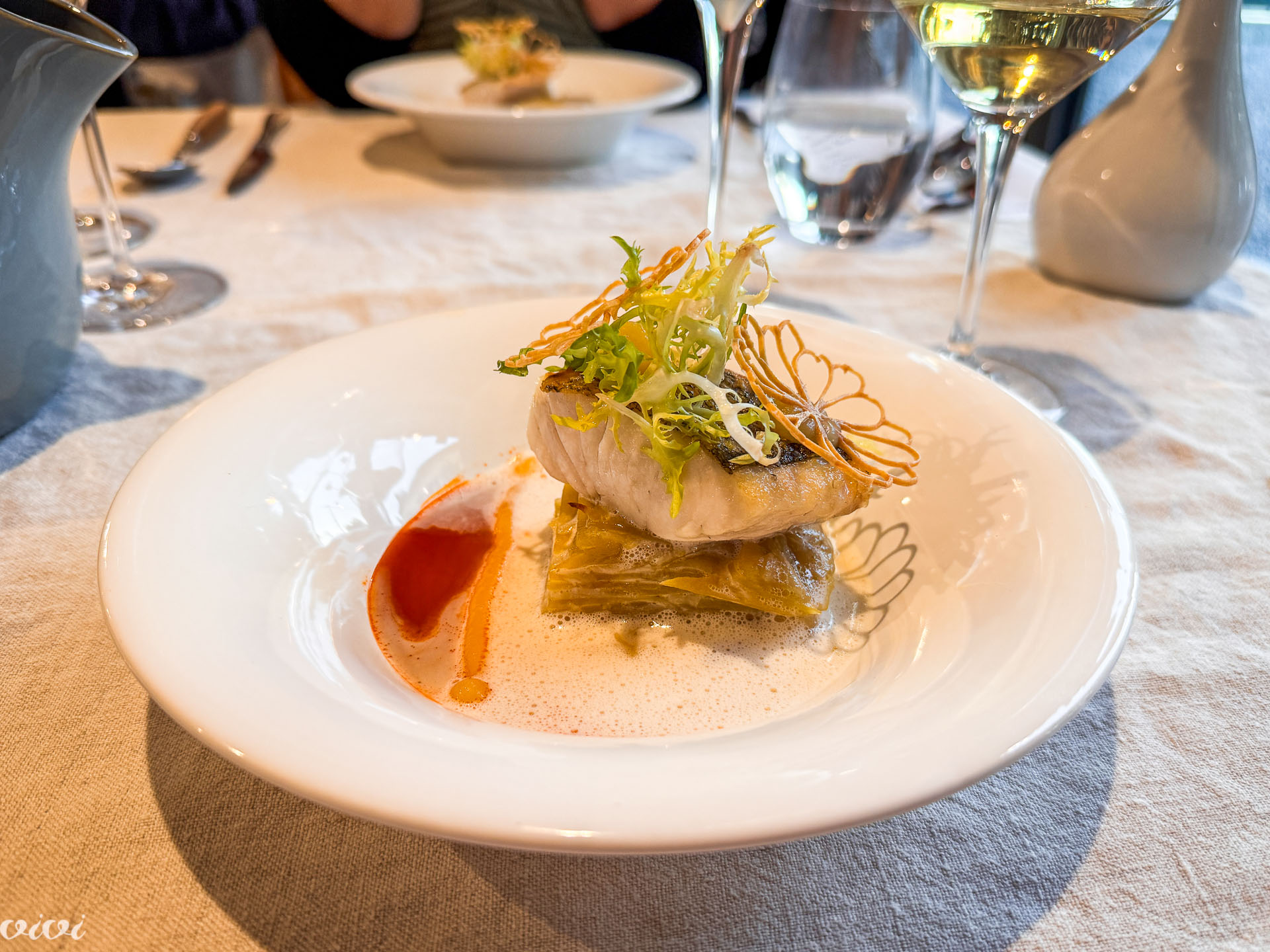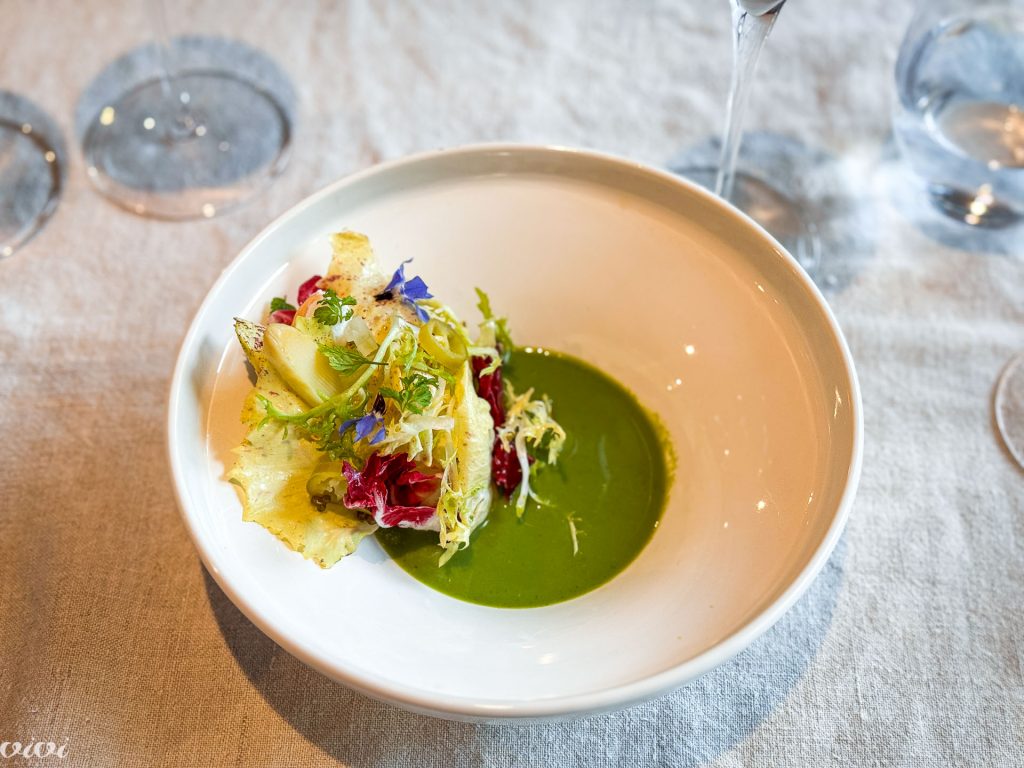 Smučev file, pečen na kožo, krompirjeva zloženka a karamelizirano šalotko, solatke s fermentirano limono, parmezanova pena in minestrone-omaka, ki vse skupaj poveže v sožitje.