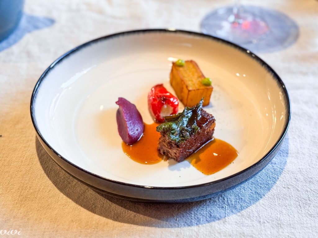 Jagenjčkova terina, demi glace omaka z malo dodanega bora, natrganega na Snežniku, krema rdečega zelja z robido, mini paprika polnjena z domačim kajmakom, krompirjeva terina in malenkost ohrovtove majoneze. Jasno je, da mora ta jed ostati na Krasninem meniju, da jo bo spoznalo čim več ljudi.