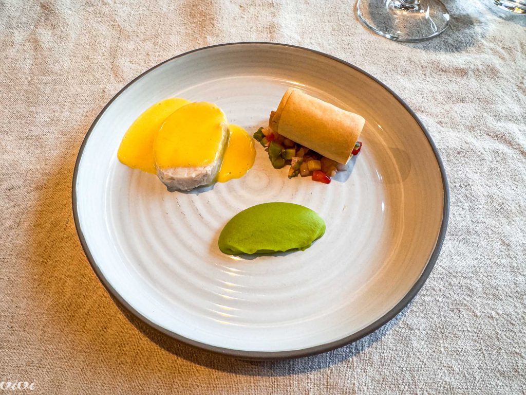 Zvitek ombrine polnjen z rakci, solatka iz špargljev, jagod in praženih pinjol, grahov pire s pehtranom, holandska omaka z bezgom. Toplo-hladna jed, ki vabi na ponovni obisk Hiše Krasne, ki ima zdaj ob chefu