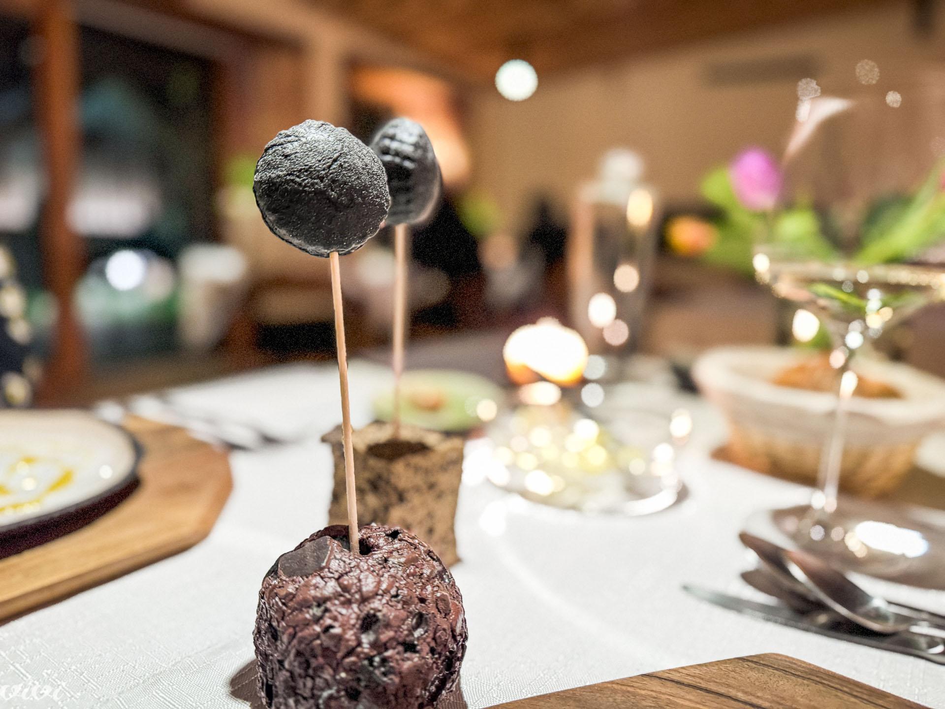 Na leseni palčki ”solato” spremlja krap, puhasto-hrustljavi krof, obarvan s črnilom.