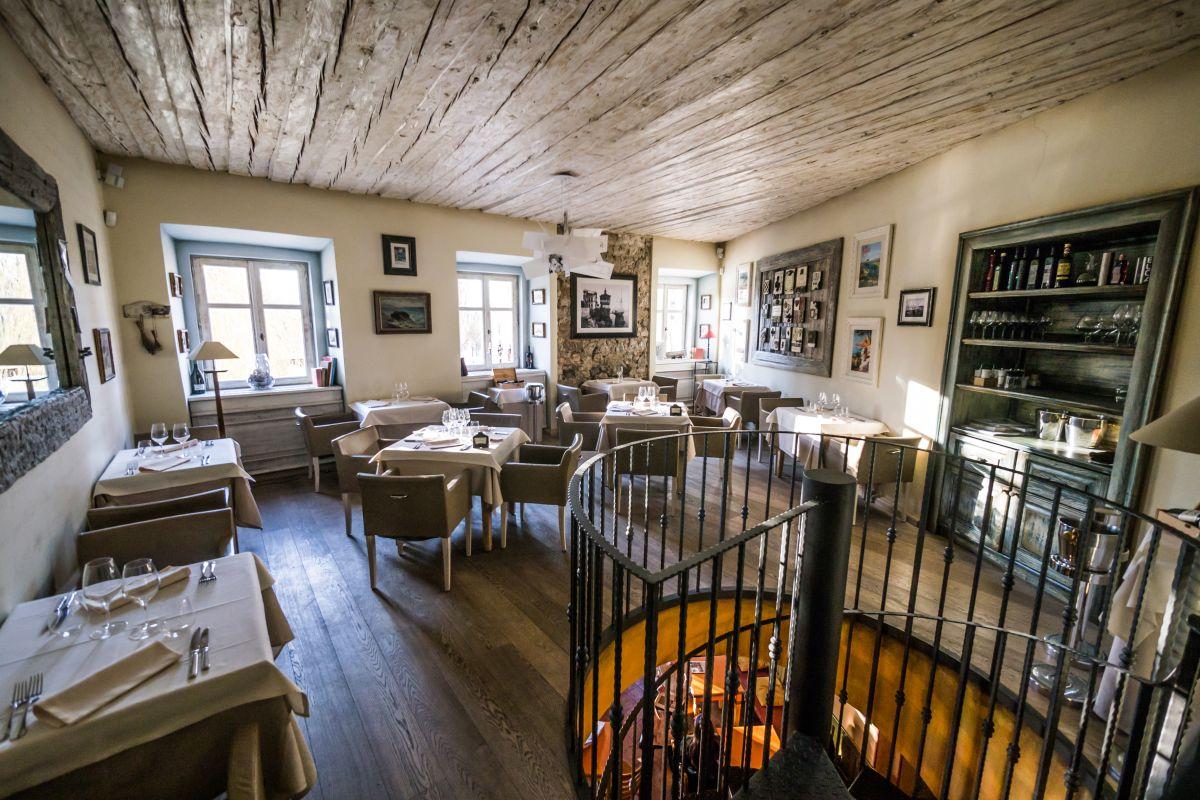 Po zavitih železnih stopnicah prideš v majhno domačno jedilnico z elegantnimi pogrinjki na šestih mizicah za dva in dveh za štiri.