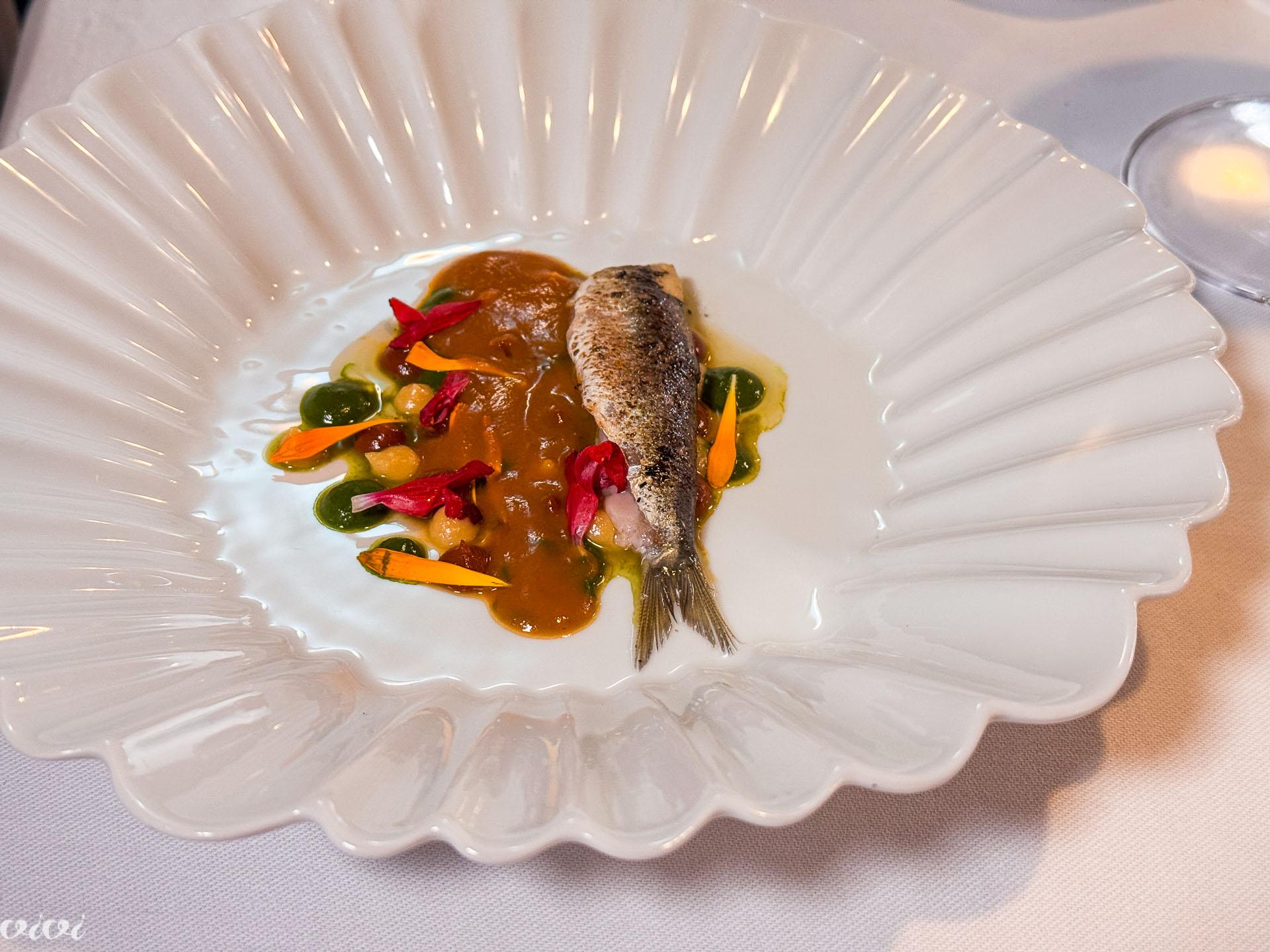 Le (ena) sardina, a tako morsko intenzivno, kot da je konec sveta (sardina iz pokrajine Finistère)! Sardina s kandiranimi paradižniki, ožgana, surova smetana, zeliščni preliv in paradižnikova juha, miso.