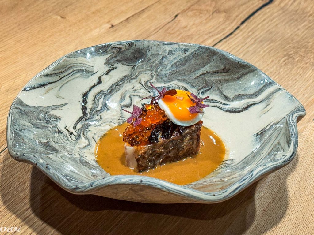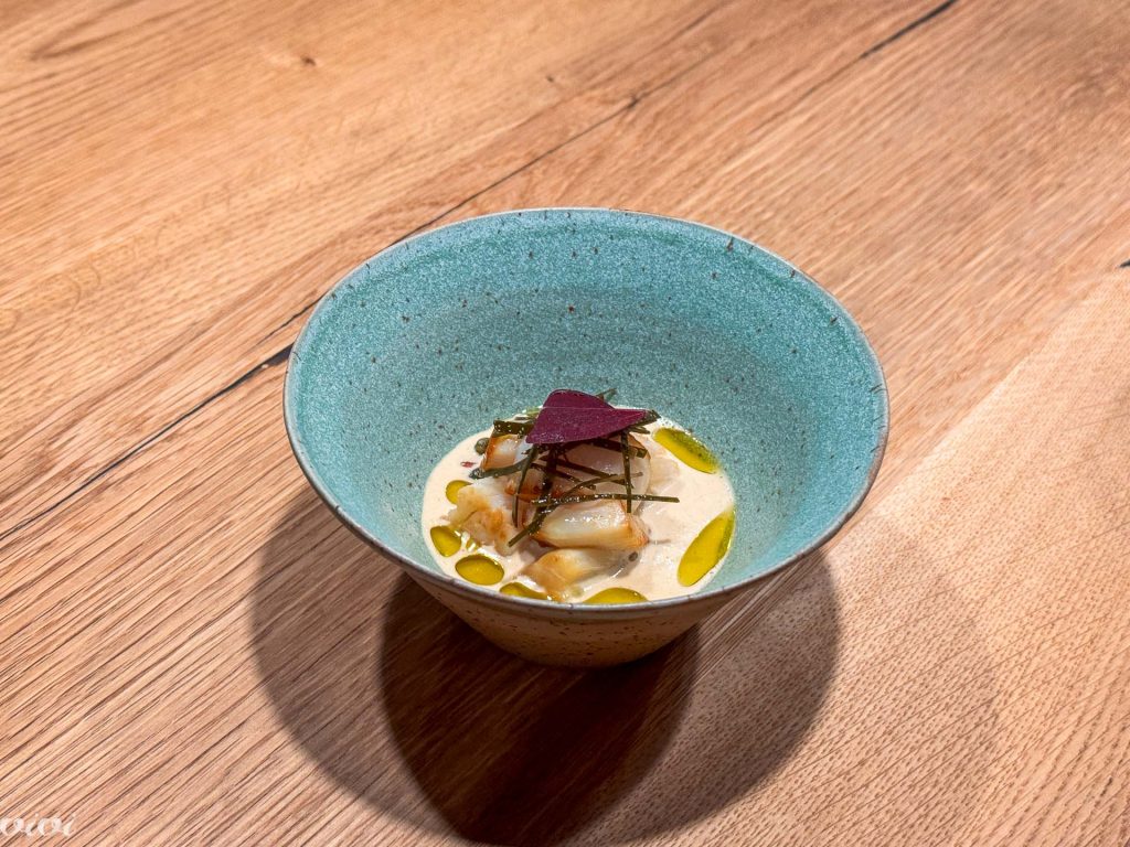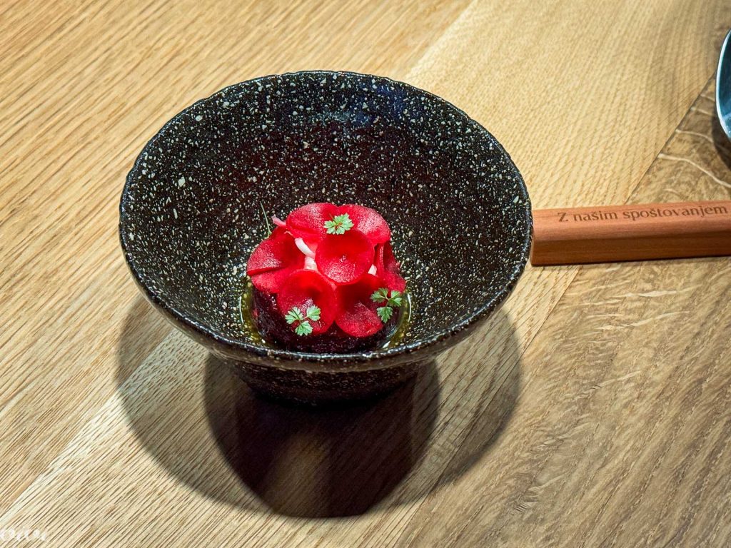 Juretove jedi so lepe! To jim priznaš, ko občuduješ njihove obline in oblike ter njegovo spretnost in potrpežljivost. Cvet rdeče pese, ki je tako prefinjen, da ti ga je žal razdreti, je zato njegov podpis, s katerim pa ne utemelji le ročne spretnosti, temveč tudi chefovsko znanje kombiniranja tehnik, oblik, tekstur in okusov. Spodaj je tatar rdeče pese, ki se je spekla do zažganosti, da si je pogrenila svojo sladkost, na njem je šopek listov okisane rdeče pese, vmes pa so hren, limona, drobnjak, bezeg, krebuljica, ribano, majoneza, olje, kis, list. A vse to v sožitju.