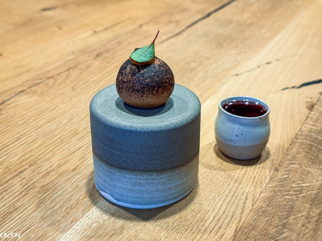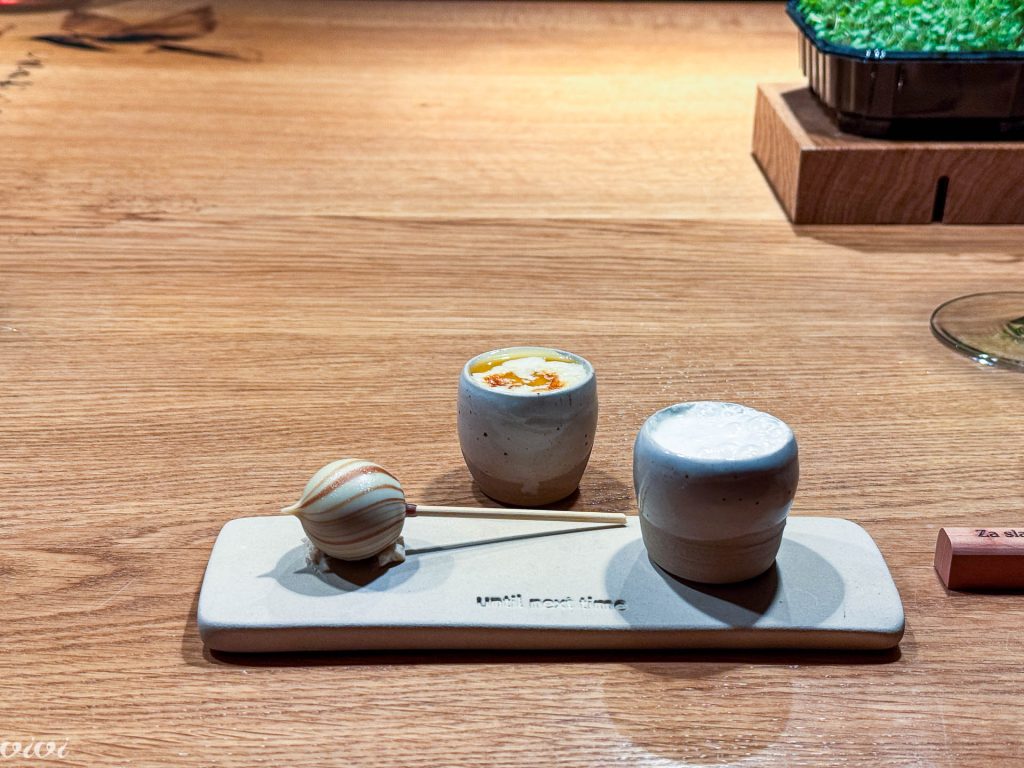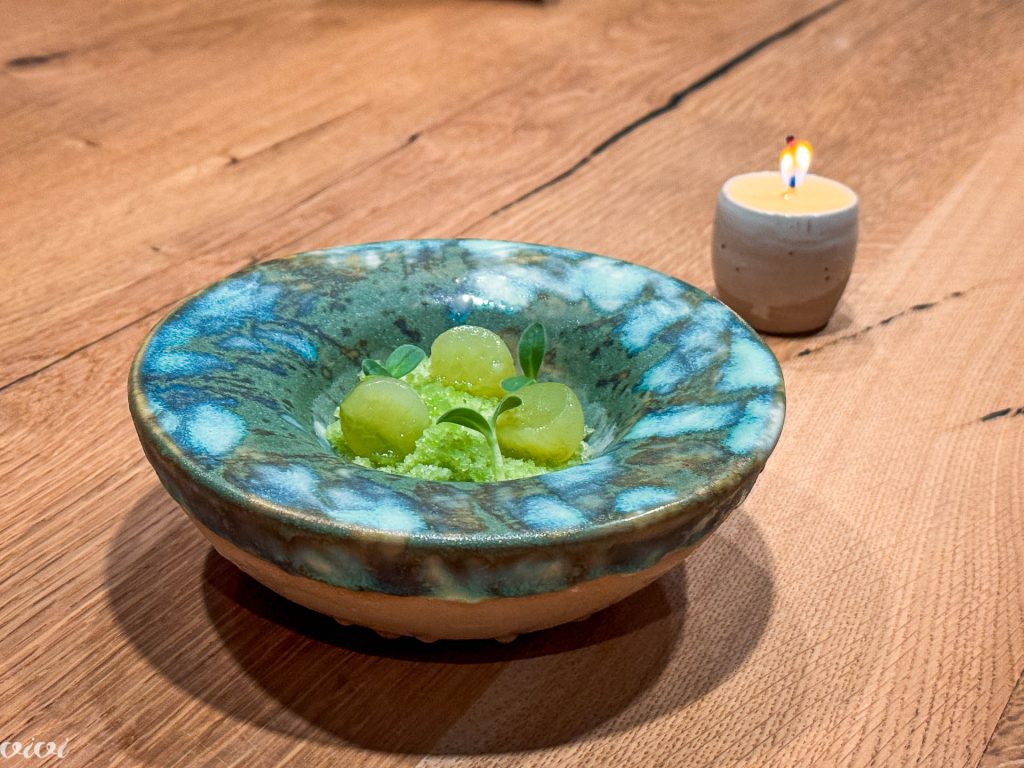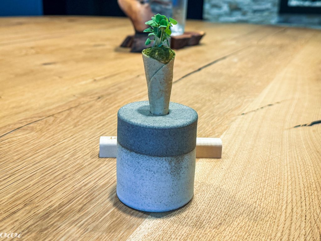 Začne se s kvizom. Maja & Jure želita goste pritegniti v svojo igro okusov, zato jih že na začetku izzoveta in spodbodeta. Kaj je to? Okušanje, če želiš, da se spremeni v doživetje, ni pasivno spremljanje, temveč aktivno sodelovanje. Prvi trije aperitivni grižljaji so zato brez opisa sestavin. Nadev v miniaturnem kornetu, ki je maksimalno hrustljav, je zelenjavno-osvežilen, mehka kremna tekstura, ki je maščobno polna, na jeziku pušča sledi aromatičnega prahu in ostanka sladke kislosti.