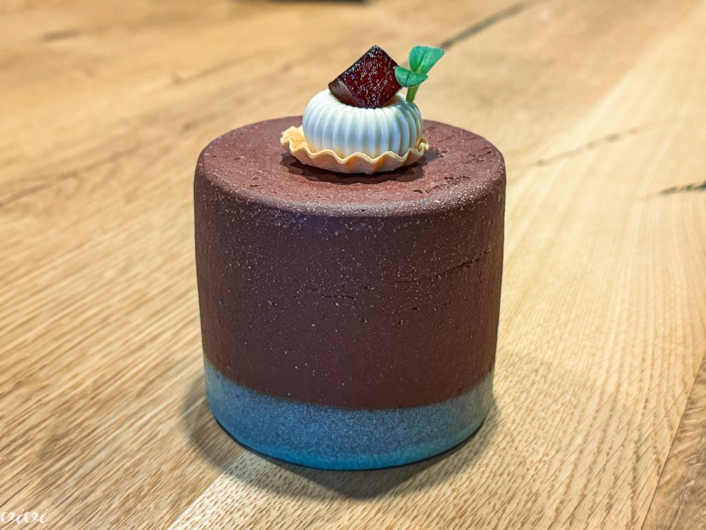V kozarčku je kapučino, v katerem se pod mlečno kremo skriva slani espresso mousse. Lučka je iz temnega čokoladnega ganacha, prelitega z belo in mlečno čokolado ter začinjenega; ker smo začeli s konjakom (kornet s paradižnikom), z njim tudi končujemo. Tretji potem pa je sveča, ki ima vosek iz mešanice bele čokolade in kakavovega masla, pod njim pa je lovorov mousse.