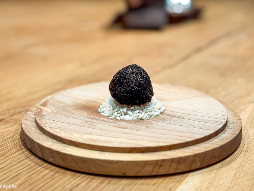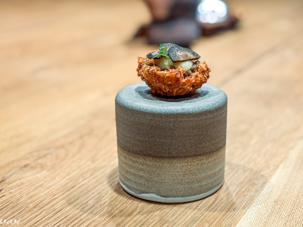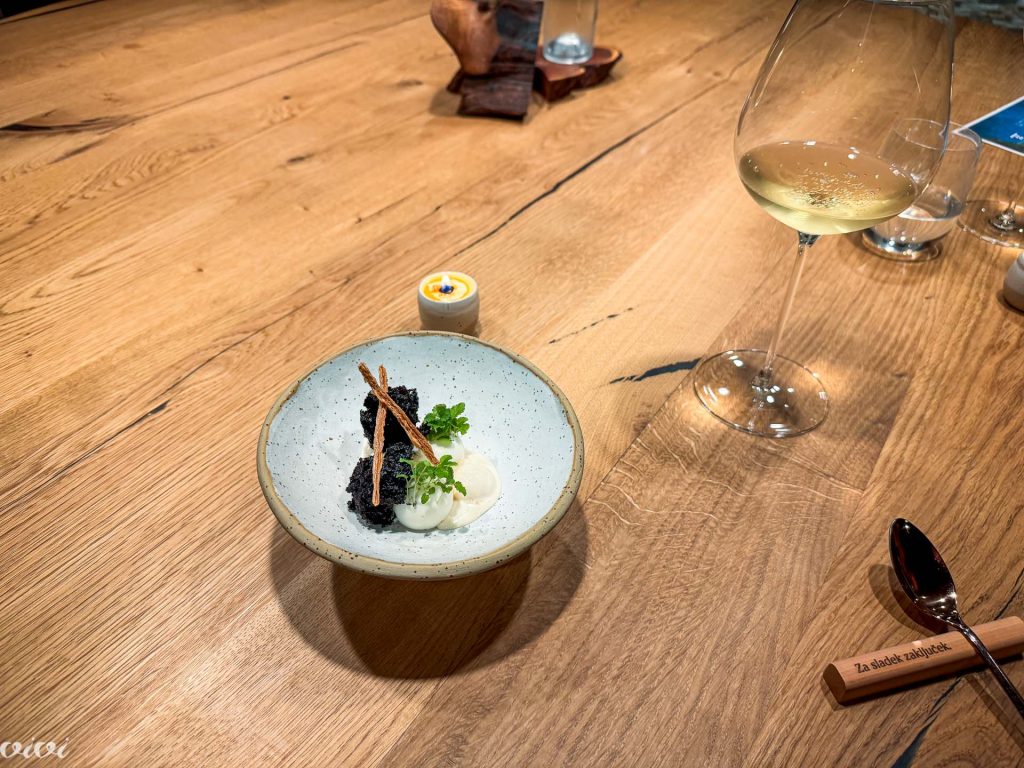 Pozdrav iz kuhinje: ocvrta cvetača, tartufova majoneza, črni oreh in krebuljica. Spretnost je še bolj dovršena, okusnost še bolj dražljiva.