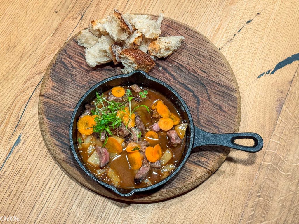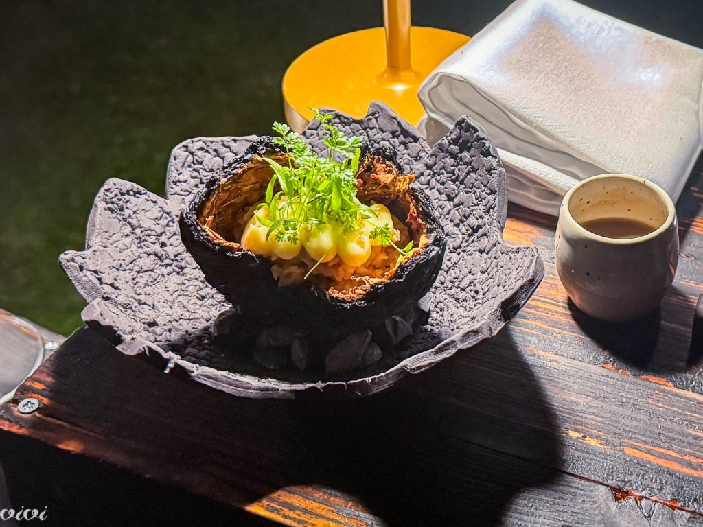 Jesenski večer je hladen, toda svetel. Jure je zakuril, Maja pa je natočila. V nazobčani skodeli, ki je v novi kuhinji pritegnila zaradi črne hrapavosti že ob prihodu, je prav takšna črna, hrapava in nazobčano prepolovljena debela lupina povsem zažgane zelene. Kar je zunaj oglje, je znotraj nektar koncentriranega nadokusa gomolja zelene, spodbujenega še z emulzijo citrusnega yuzuja. Vse skupaj je tako neposredno, prvinsko, iskreno in v žilo, da poplaknemo z juho iz brinovih jagod. Niti pri tabornikih ni tako fajn, kot je tukaj fino.