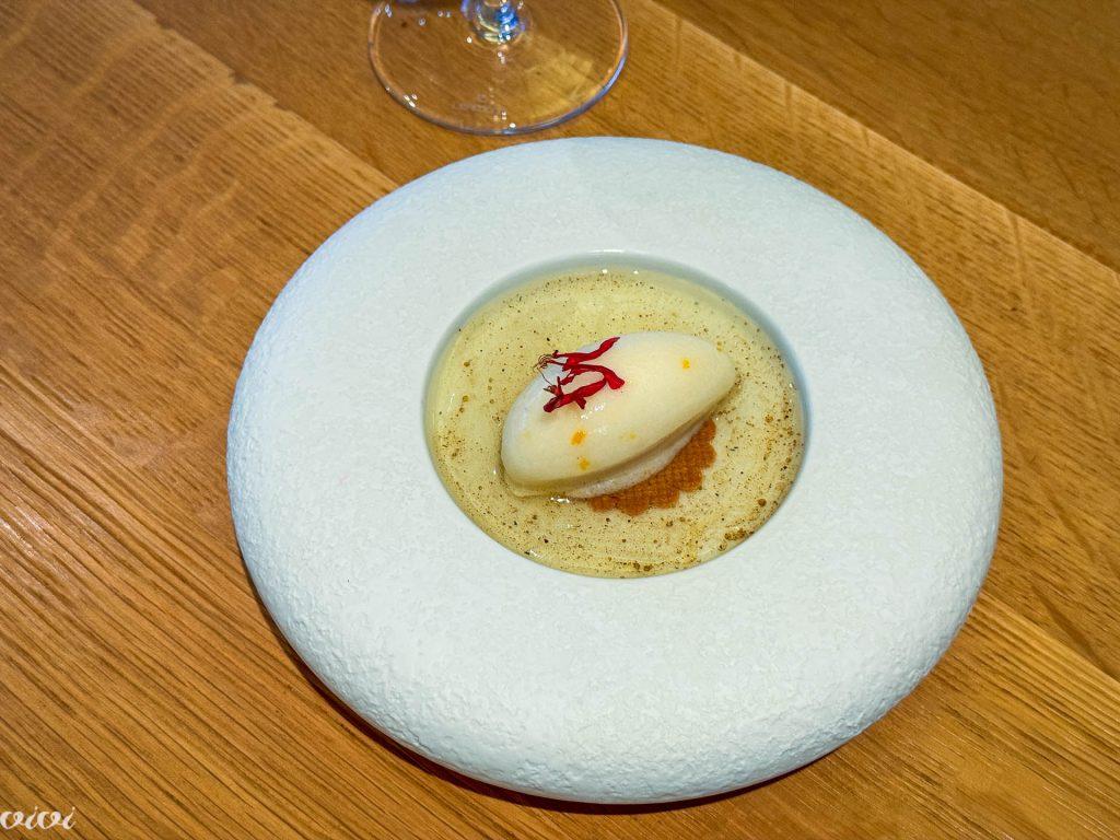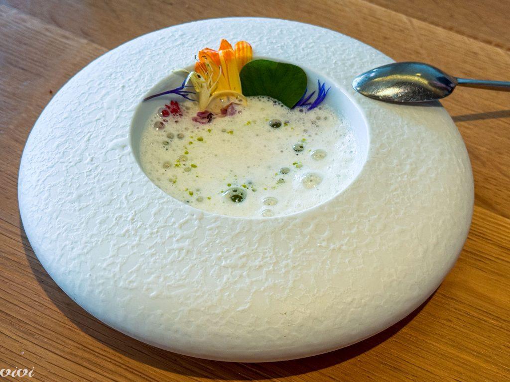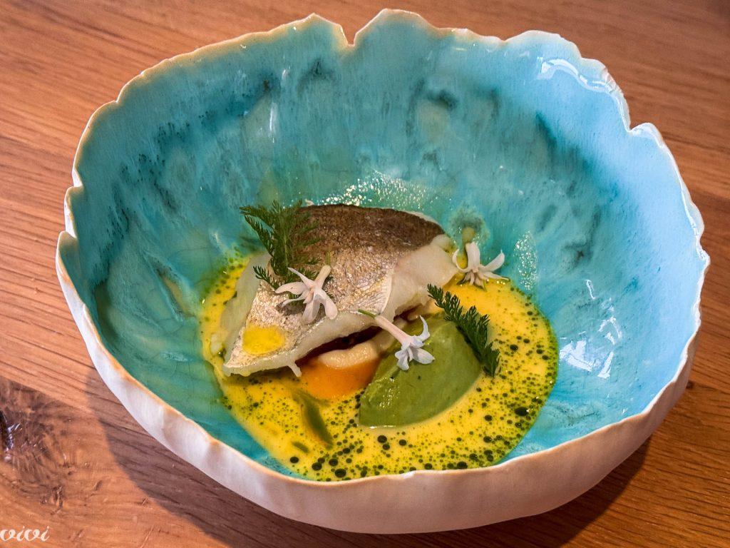 Nežno kuhan oslič iz Roscoffa, Guillaume’s kozji sir, čemaž iz Monts d’Arrée, česnova omaka, čemaževa krema.