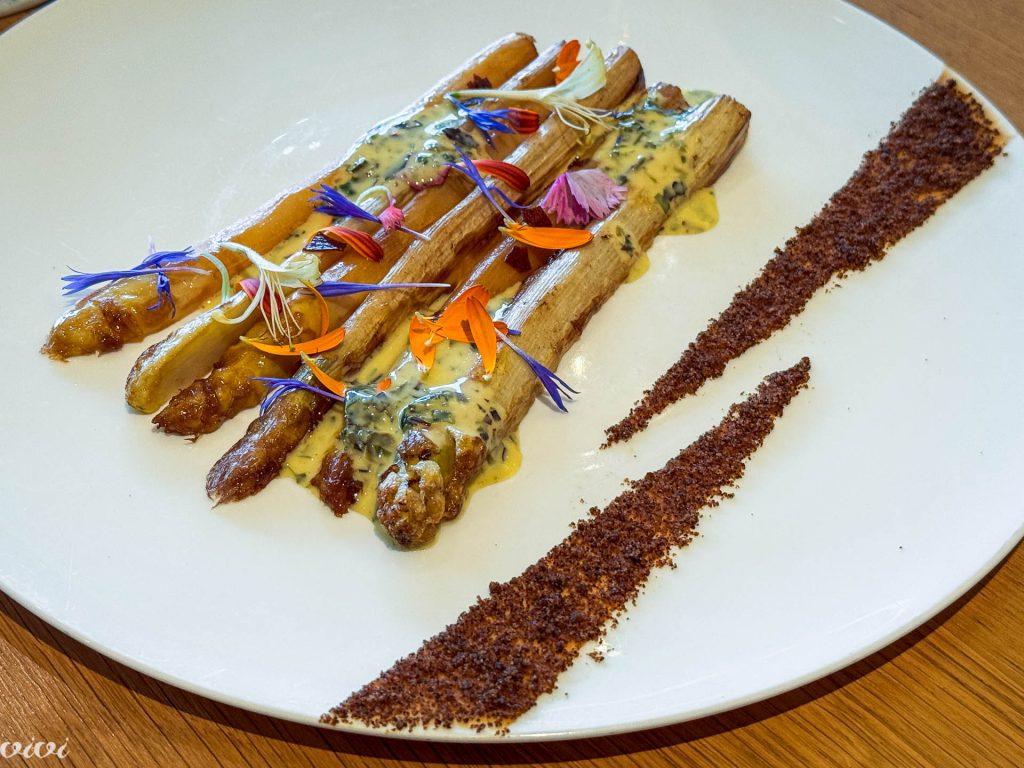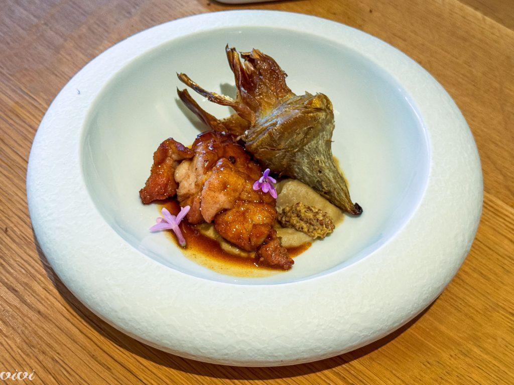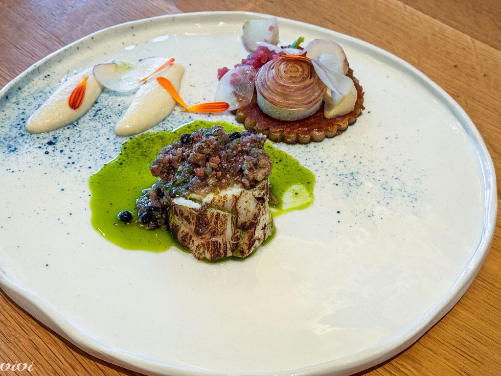 Morska žaba iz Roscoffa, ajdov farz (kot blin), različne teksture bele repe z bezgom iz Monts d’Arrée (okisana, pečena, sveža krema), sauce vierge.