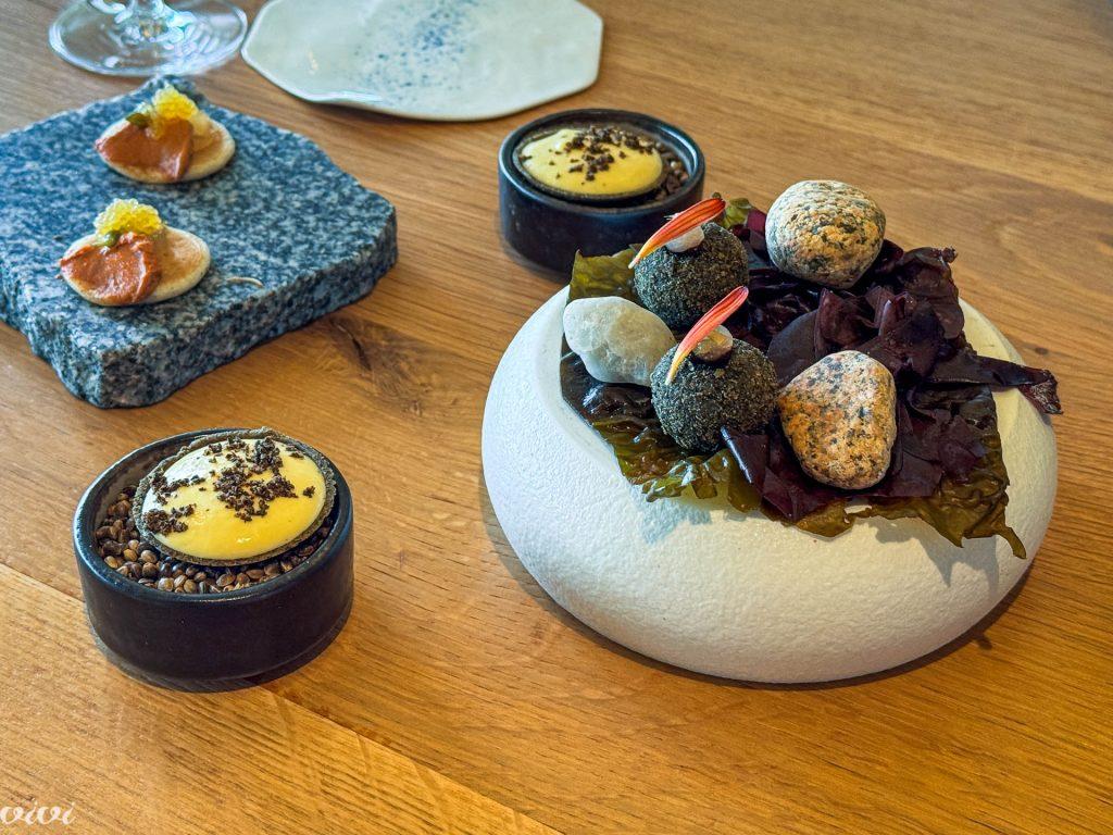 Pozdravni grižljaji: tartelet z jajčno kremo in prahom črnih oliv; blin z botargo bele ribe, ikre, čemažev poper, tamarind; ocvrta morska kroglica.