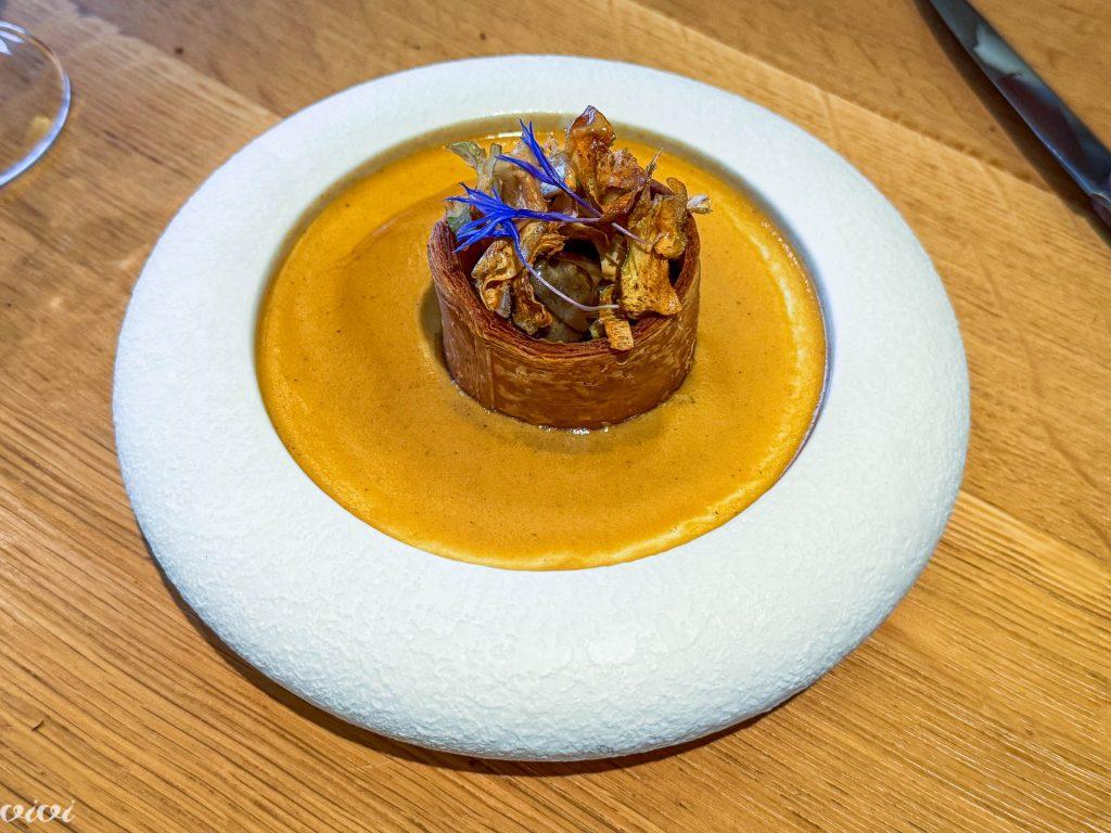 Drugi del glavne jedi: vol-au-vent v slogu blanquette. Maslena pastetka polnjena z ragujem iz telečjega podbradka in gob.