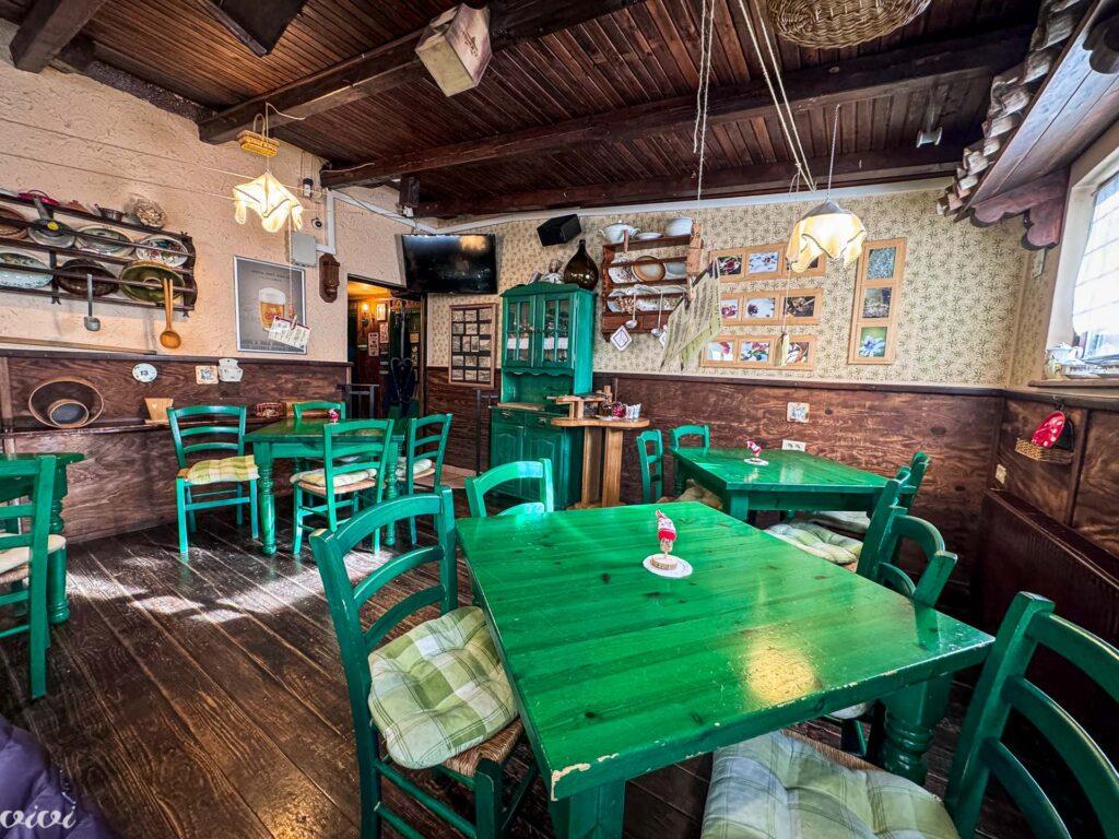 V Žogici so še mize postrani, da je videti še bolj razmetano. To je tisti poslovenjena shabby chic obrabljenost, ki je v arhitekturnem dizajnu kombinacija starega (vintage) in modernega, s ciljem, da ustvari zaupanje domačnosti s pomočjo zaigrane ponošenosti. V leseni verandi sicer ni po muzejskih in etnografskih pravilih, toda Ošterija Žogica je zelo blizu preprosti slovenski predstavi, kako je bilo v gostilni nekoč.
