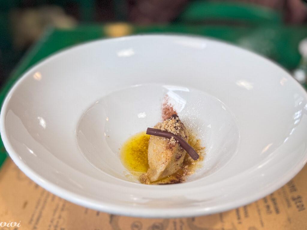 Regutova krema v finem testu, fižolov mus in sladki ocvirki v čokoladi. Sladica, ki je ne pričakuješ. Četudi nisi opazil, da bi bile lahko predhodne jedi v čast regutu bolj drzne, zdaj sladici grozi nevarnost, da bo marsikomu preveč hrabra. Ampak, to ni z vidika dobrojedstva graja, temveč kvečjemu pohvala. Tako zelenjavna sladica, v kateri je za povrh še pujs v čokoladi!