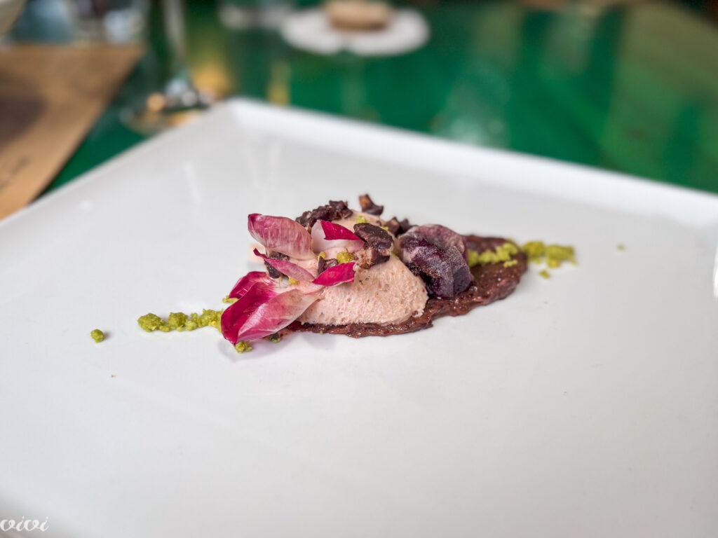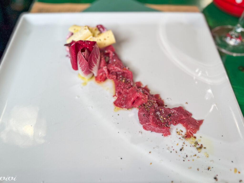 Regutov ‘tatarski’ z rdečo peso in karpačo govedine. Karpačo, še posebej, ko je govedina tako mehka, sočna in voljna in diši po olivnem olju, ne pa po prehitrem odtajanju, je vedno dobrodošel. Če je s sezonskim dodatkom, pa še toliko bolj.