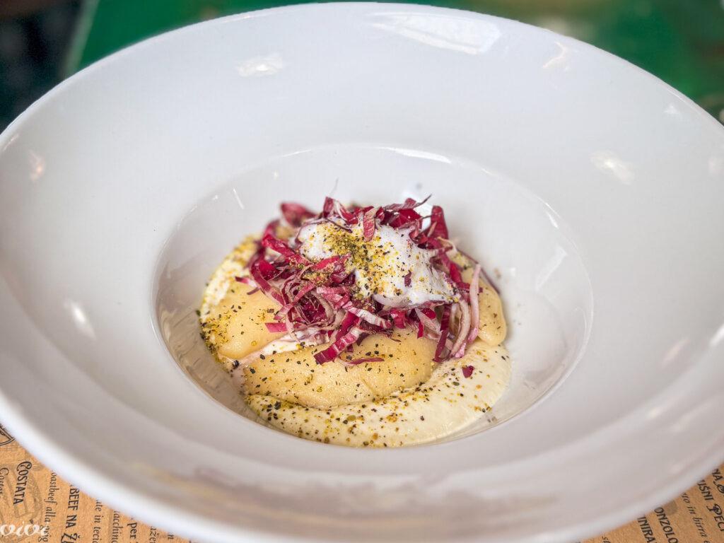 Regut ku če bet, solata s solkanskim radičem, kuhanim krompirjem, ocvirki, česnom, fižolom in poširanim jajcem. Jed, ki se ponavlja vsako leto, ker zaradi radičeve solate komaj čakaš konec in začetek leta. Naj bo kuhar še tako ustvarjalen z radičem, vseeno mora jedec priznati, da je solkanski radič najboljši v solati.
